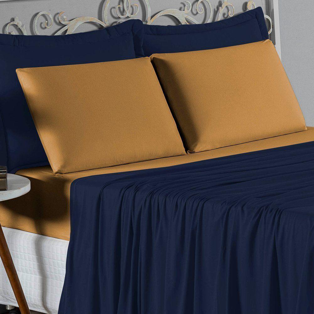 Jogo De Cama Queen Nobre 4 Peças Lençol Com Elástico De 30cm De Altura Malha 100% Algodão - Azul-marinho / Cobre