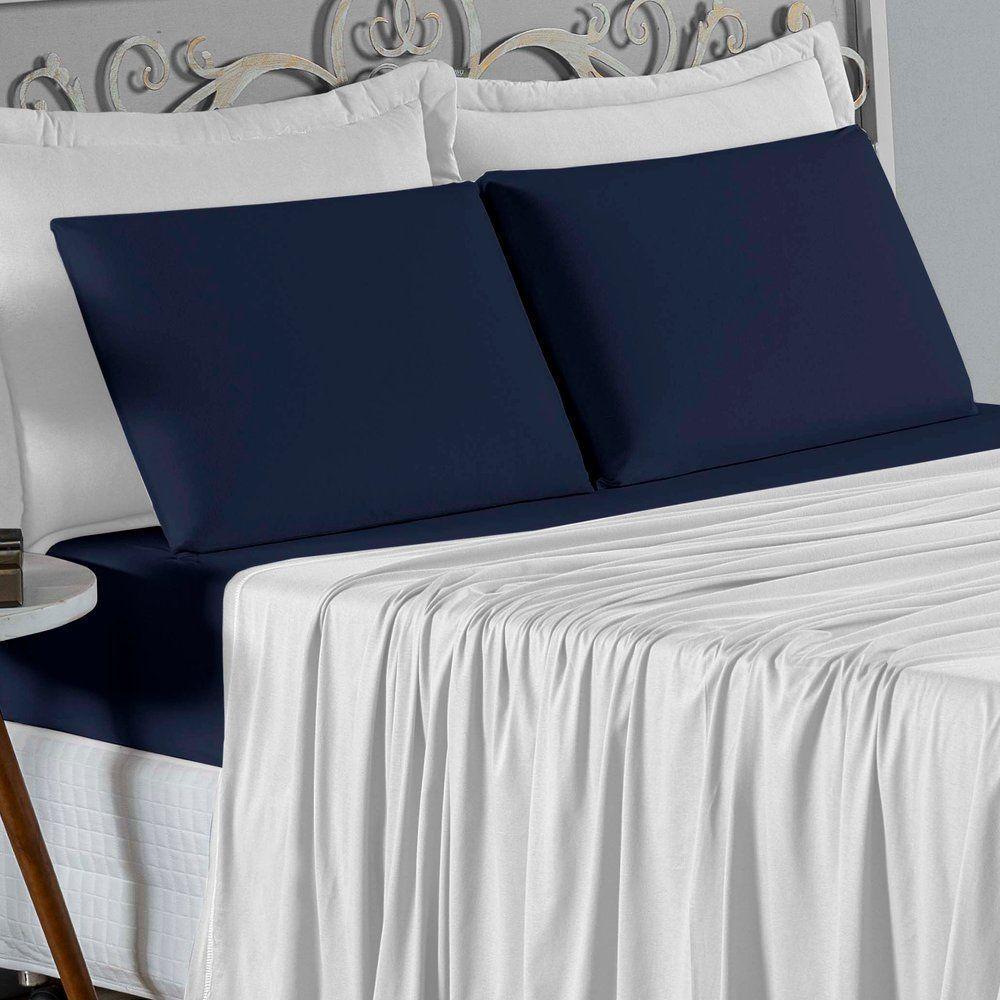 Jogo De Cama Queen Nobre 4 Peças Lençol Com Elástico De 30cm De Altura Malha 100% Algodão - Branco / Azul-marinho