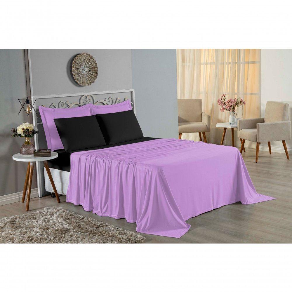 Jogo De Cama Queen Nobre 4 Peças Lençol Com Elástico De 30cm De Altura Malha 100% Algodão - Lilás / Preto