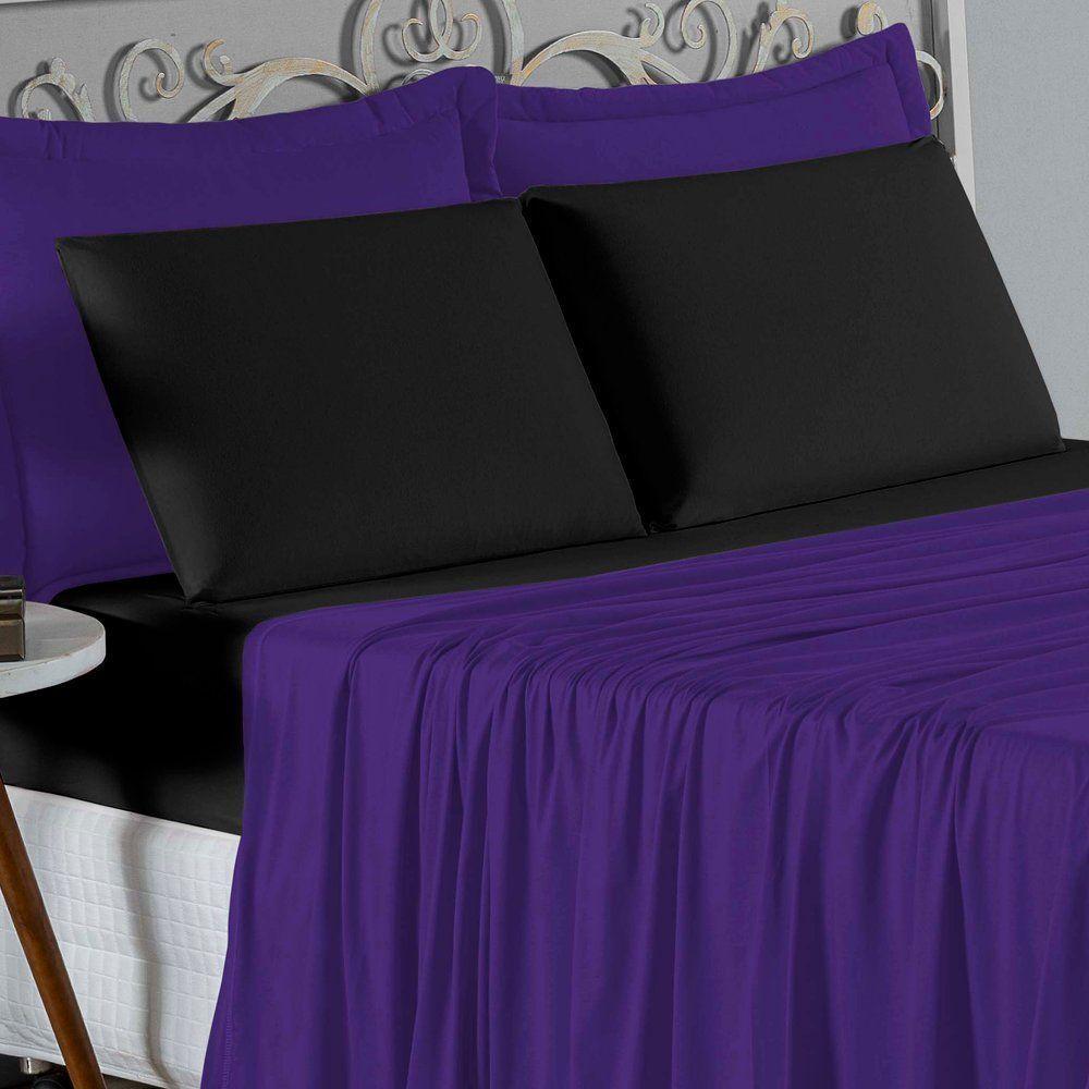 Jogo De Cama Queen Nobre 4 Peças Lençol Com Elástico De 30cm De Altura Malha 100% Algodão - Roxo / Preto