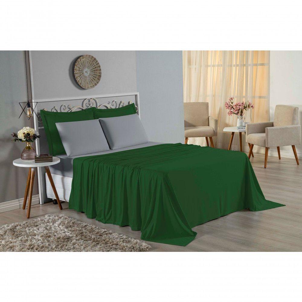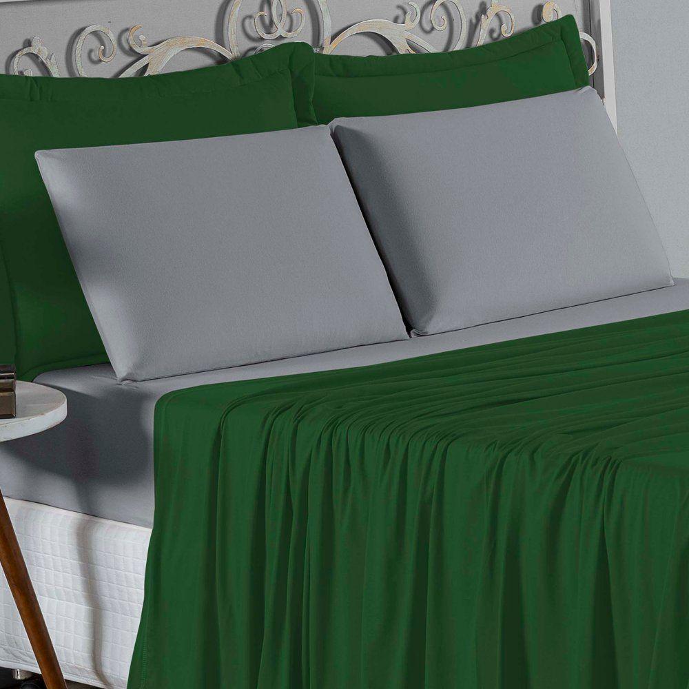 Jogo De Cama Queen Nobre 4 Peças Lençol Com Elástico De 30cm De Altura Malha 100% Algodão - Verde-bandeira / Cinza