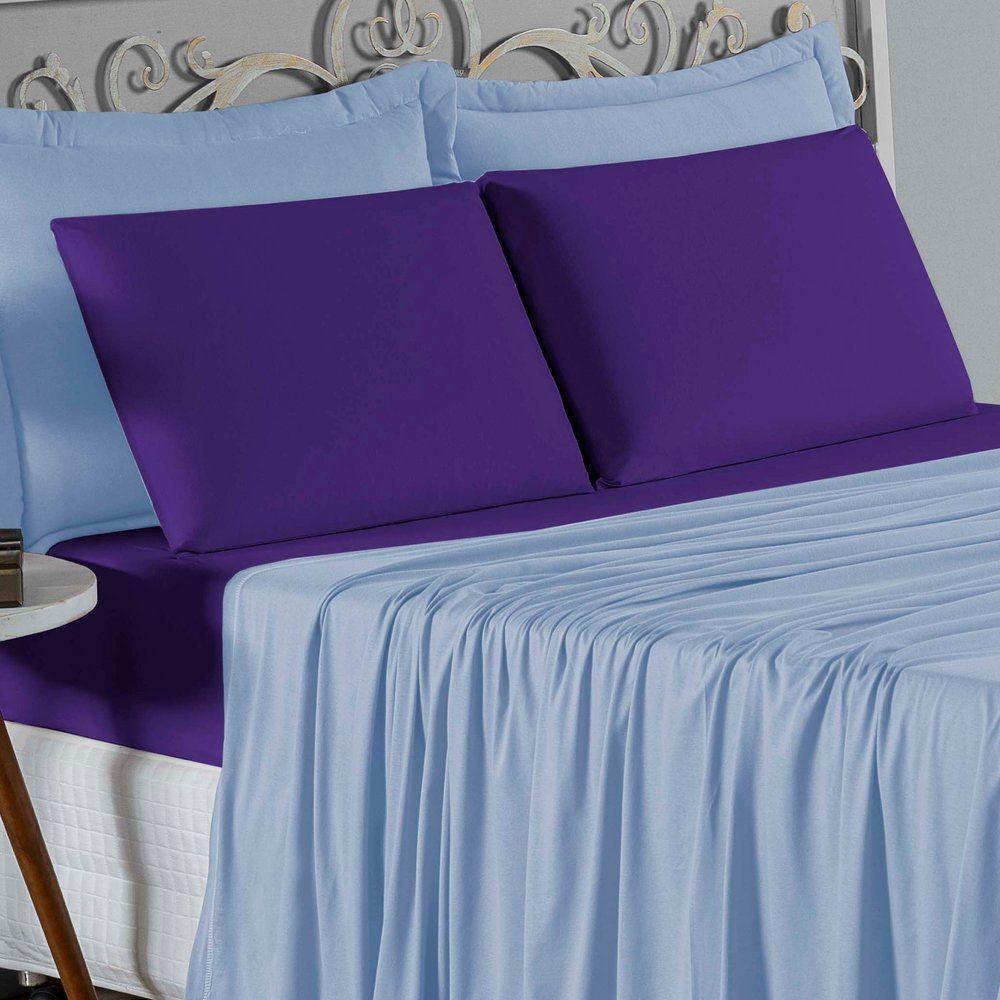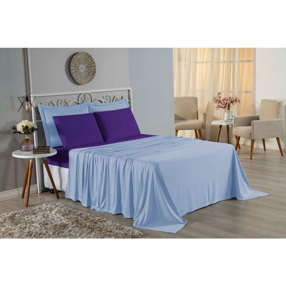 Jogo De Cama Queen Nobre 4 Peças Lençol Com Elástico De 30cm De Altura Malha 100% Algodão - Azul-bebê / Roxo