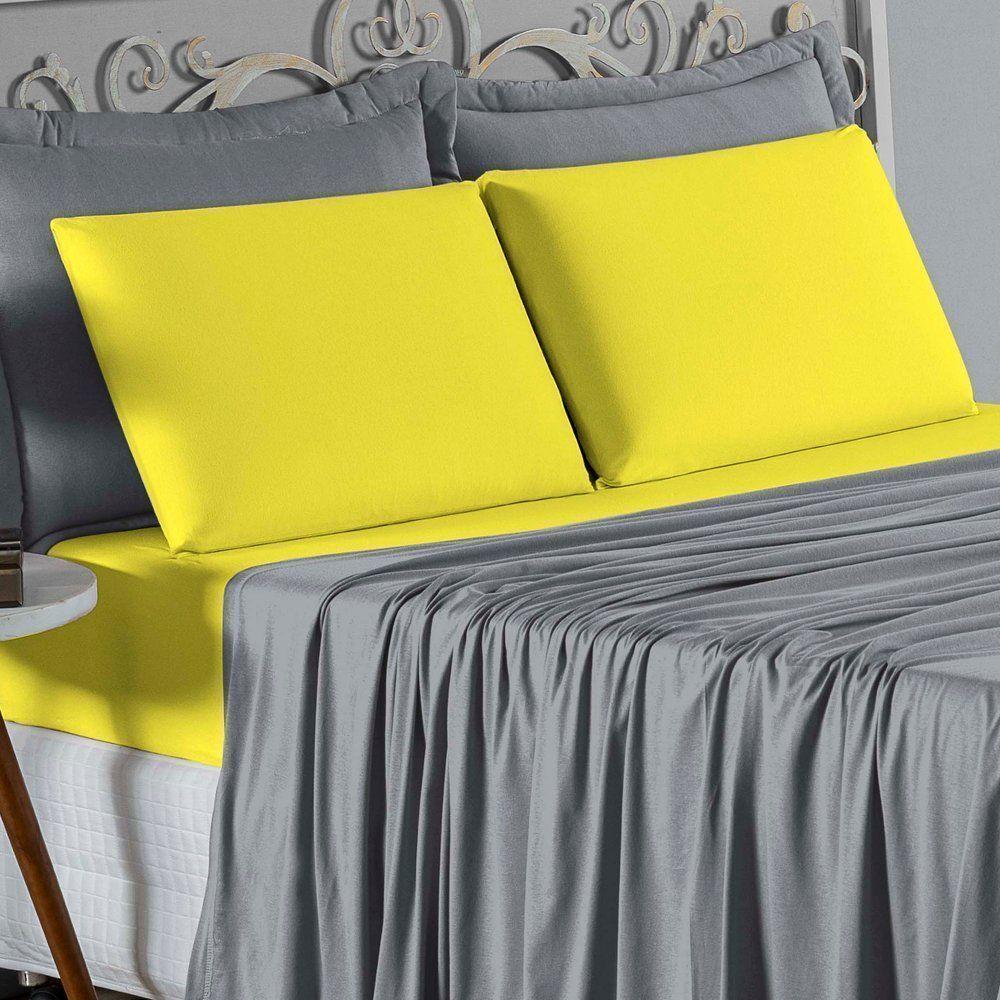 Jogo De Cama Queen Nobre 4 Peças Lençol Com Elástico De 30cm De Altura Malha 100% Algodão - Cinza / Amarelo