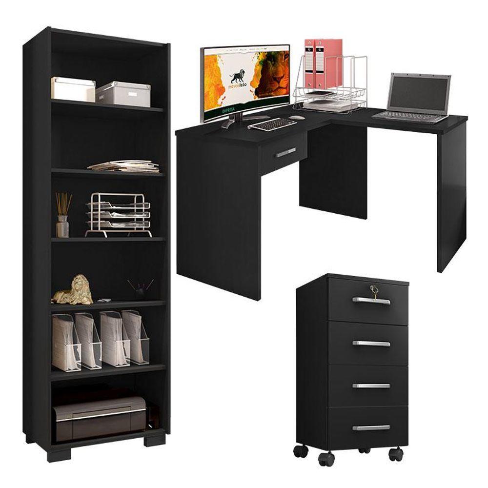 Mesa Para Computador Com Gaveta E Extensora E Gaveteiro Gávea Com Chave E Livreiro Office Preto Fosco - Móveis Leão