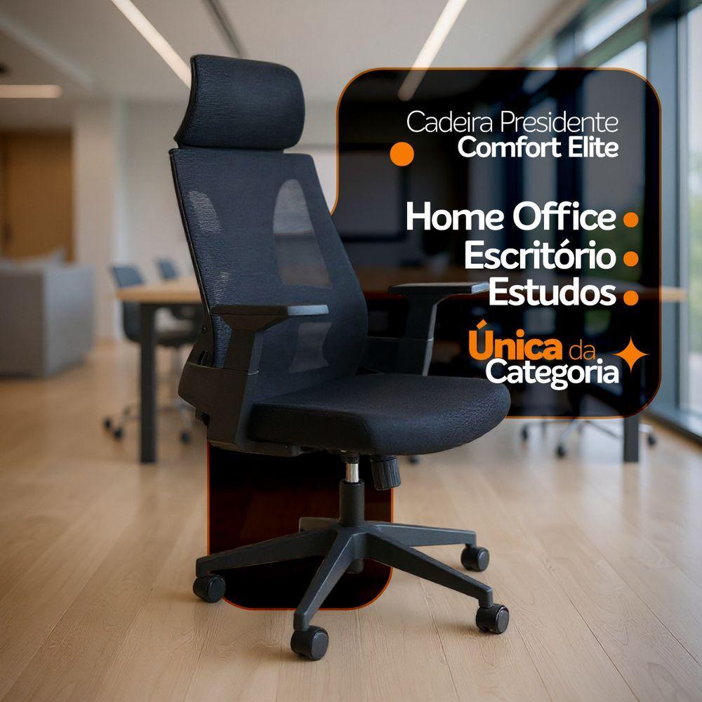 Cadeira Presidente Oficial Comfort Elite 2Cadeira Presidente Oficial Comfort Elite com Apoio de CabeçaConforto robusto, estrutura resistente e design executivo.A Comfort Elite é a escolha ideal para quem valoriza ergonomia, firmeza e qualidade nos mínimos detalhes. Com estrutura reforçada, assento de alta densidade e apoio de cabeça amplo, é perfeita para quem passa longos períodos trabalhando ou estudando.A inclinação sincronizada é um mecanismo presente em cadeiras e poltronas que permite ao usuário ajustar o encosto e o assento de forma simultânea, proporcionando maior conforto e ergonomia durante o uso. Esse tipo de reclinação é comumente encontrado em móveis de escritório, especialmente em cadeiras de trabalho, onde a postura correta é essencial para evitar dores e lesões musculares.O encosto é revestido em tecido Mesh Premium, composto por 64% de poli elastômero e 36% de poliéster. Já o assento conta com espuma 35D, revestida em tecido 100% poliéster.Atende aos requisitos da NR-17 além disso possui o cobiçado selo BIFMA de qualidade, garantindo durabilidade e desempenho excepcionais.Garantia de 2 anos!Destaques do Produto:Encosto de cabeça fixo revestido por mesh para acompanhar o design do encostoEstrutura do encosto em PP virgem com fibra, resistente e durável.Apoio lombar em PP preto, fixo, oferecendo suporte constante à coluna. Apoios de braço modelo T, integrados em PP preto. Assento com espuma de alta densidade (D45), conforto firme e duradouro. Placa de eucalipto multilaminada (10 camadas – 12 mm), de alta dureza. Mecanismo butterfly 2,5 mm com trava de posição. Pistão a gás nitrurado #85, curso de 40 mm, para ajuste suave de altura. Base resistente em PP preto Ø 320 mm. Rodízios de nylon Ø 50 mm, com movimentação leve e silenciosa. Dimensões Aproximadas:Altura total: 95 a 105 cm Altura do assento ao chão: 44 a 53 cm Largura entre braços: 63 cm Largura do assento: 52 cm Profundidade do assento: 52 cm Altura dos braços: 21 cm Altura do encosto: 20 cm Largura do encosto: 36 cm Distância entre os pés: 62 cm A Comfort Elite combina resistência, funcionalidade e elegância em uma cadeira ideal para home office ou ambientes corporativos.Desempenho diário com conforto . Escolha a Comfort Elite.Atende todos os padrões de ergonomia NR-17, além disso possui o cobiçado selo BIFMA de qualidade, garantindo durabilidade e desempenho excepcionais.