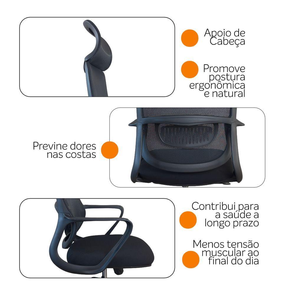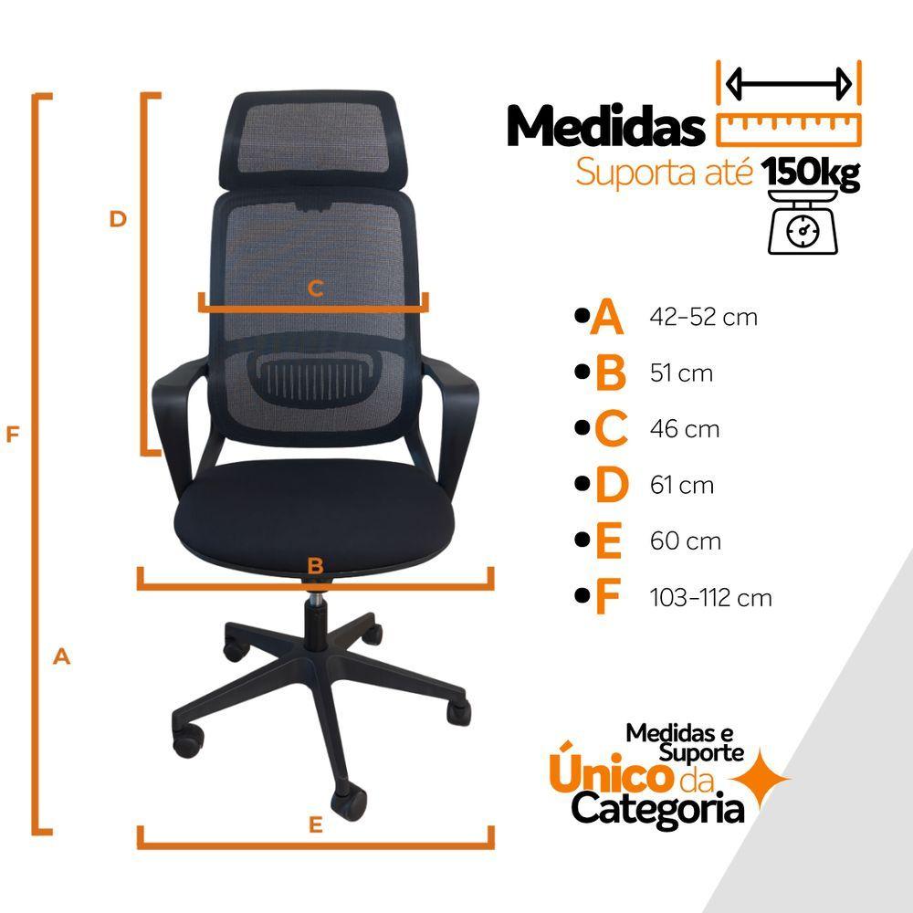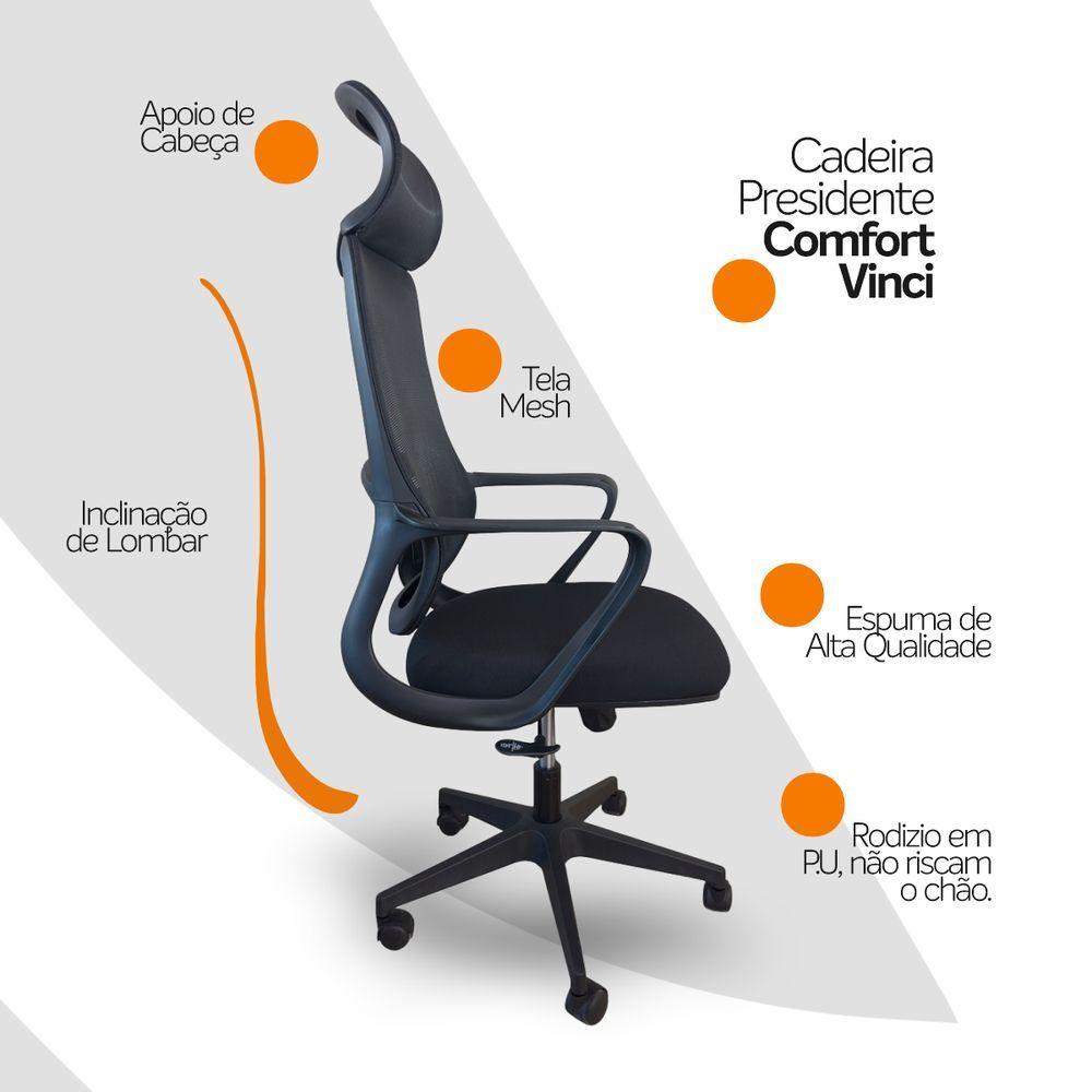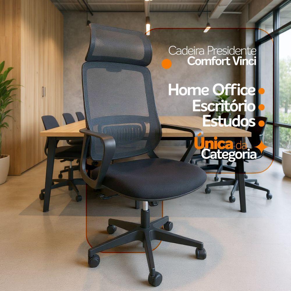 Cadeira Presidente Oficial Comfort Vinci Com ApoioCadeira Presidente Oficial Comfort VinciDesign moderno, conforto funcional e leveza para o dia a dia.A Comfort Vinci é ideal para quem busca uma cadeira com visual contemporâneo e recursos essenciais para uma rotina produtiva. Com estrutura leve, detalhes ergonômicos e acabamento de qualidade, ela oferece o suporte certo para seu espaço de trabalho.Comfort Vinci entrega ergonomia de ponta, materiais de qualidade e visual moderno.O encosto é revestido em tecido Mesh Premium, composto por 64% de poli elastômero e 36% de poliéster. Já o assento conta com espuma 35D, revestida em tecido 100% poliéster.Atende aos requisitos da NR-17. Além disso, possui o cobiçado selo BIFMA de qualidade, garantindo durabilidade e desempenho excepcionais!Garantia de 2 anos!Diferenciais do Produto:Estrutura do encosto em PP preto, com apoio lombar elástico fixo para suporte ergonômico.Revestimento em malha especial respirável, espessada e de alta densidade. Assento com espuma de média macia, alta resiliência e contra capa em polipropileno. Apoio de braços fixos em PP, modelo integrado tipo “degrau”. Base com trava de posição, permitindo estabilidade durante o uso. Pistão a gás preto #85, com curso de 40 mm para ajuste suave de altura. Estrela pirâmide com fibra de vidro em nylon com diâmetro de 320mm, resistentes e leves. Rodízios de nylon preto Ø 50 mm para movimentação silenciosa e estável. Dimensões Aproximadas:Altura total: 103 a 112 cm Altura do assento ao chão: 42 a 52 cm Largura do assento: 51 cm Profundidade do assento: 51 cm Largura entre braços: 58 cm Altura dos braços: 21 cm Largura do encosto (com encosto): 36 cm Altura do encosto (com encosto): 19 cm Distância entre os pés: 60 cm A Cadeira Presidente Comfort Vinci é perfeita para home office, salas de reunião ou escritórios que valorizam funcionalidade, conforto e um visual moderno.Praticidade, leveza e conforto ao seu alcance com a Comfort Vinci.