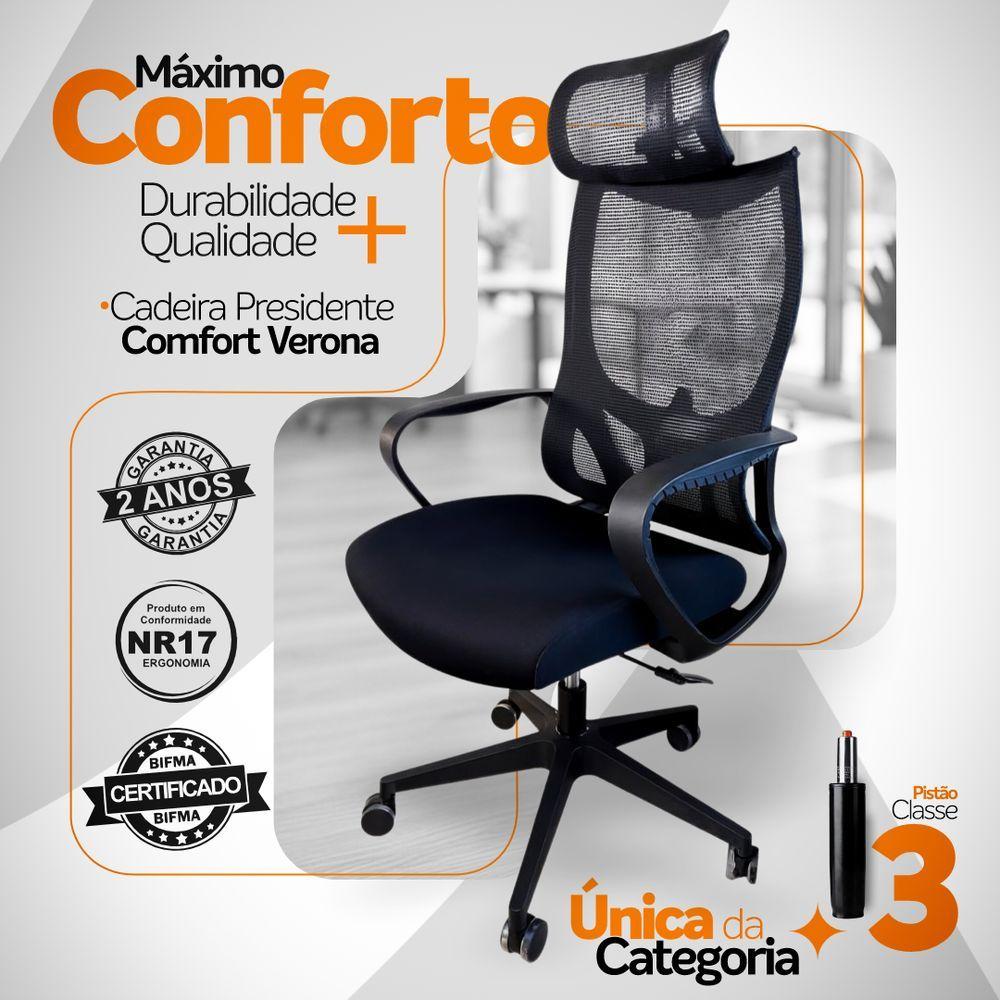 Kit 5 Cadeiras Presidente Oficial Comfort Verona Com ApoioCadeira Presidente Oficial Comfort VeronaDesign ergonômico, conforto inteligente e estilo profissional.Projetada para quem exige conforto e postura durante longas horas de trabalho, a Cadeira Comfort Verona entrega ergonomia de ponta, materiais de qualidade e visual moderno.O encosto é revestido em tecido Mesh Premium, composto por 64% de poli elastômero e 36% de poliéster. Já o assento conta com espuma 35D, revestida em tecido 100% poliéster.Atende aos requisitos da NR-17. Além disso, possui o cobiçado selo BIFMA de qualidade, garantindo durabilidade e desempenho excepcionais!Garantia de 2 anos!Diferenciais do Produto:Encosto com curvatura em “S” – Segue a anatomia da coluna, oferecendo suporte lombar natural. Apoio de cabeça multi-regulável – Ajuste de altura e ângulo para aliviar tensões cervicais. Apoio de braços fixos – Em PP virgem com fibra de vidro, alta resistência e acabamento sofisticado. Assento anatômico – Espuma moldada de alta resiliência Mecanismo butterfly – Curso médio de 25 mm, flexível e confiável. Pistão a gás preto #85 – Curso de 40 mm para ajuste de altura suave. Base em nylon Ø 320 mm – Leve, resistente com fibra de vidro. Rodízios de nylon Ø 55 mm – Movimentação fluida e silenciosa. Dimensões Aproximadas:Altura total: 100 a 110 cm Altura do assento até o chão: 34 a 50 cm Largura entre braços: 59 cm Largura do assento: 49 cm Profundidade do assento: 51 cm Altura dos braços: 28 cm Distância entre os pés: 67 cm Altura do encosto (com apoio): 18 cm Largura do encosto (com apoio): 35 cm Ideal para home office, escritórios executivos ou salas de reunião, a Comfort Verona une ergonomia, leveza e elegância em uma só cadeira.Conforto e produtividade ao seu alcance com a Comfort Verona.