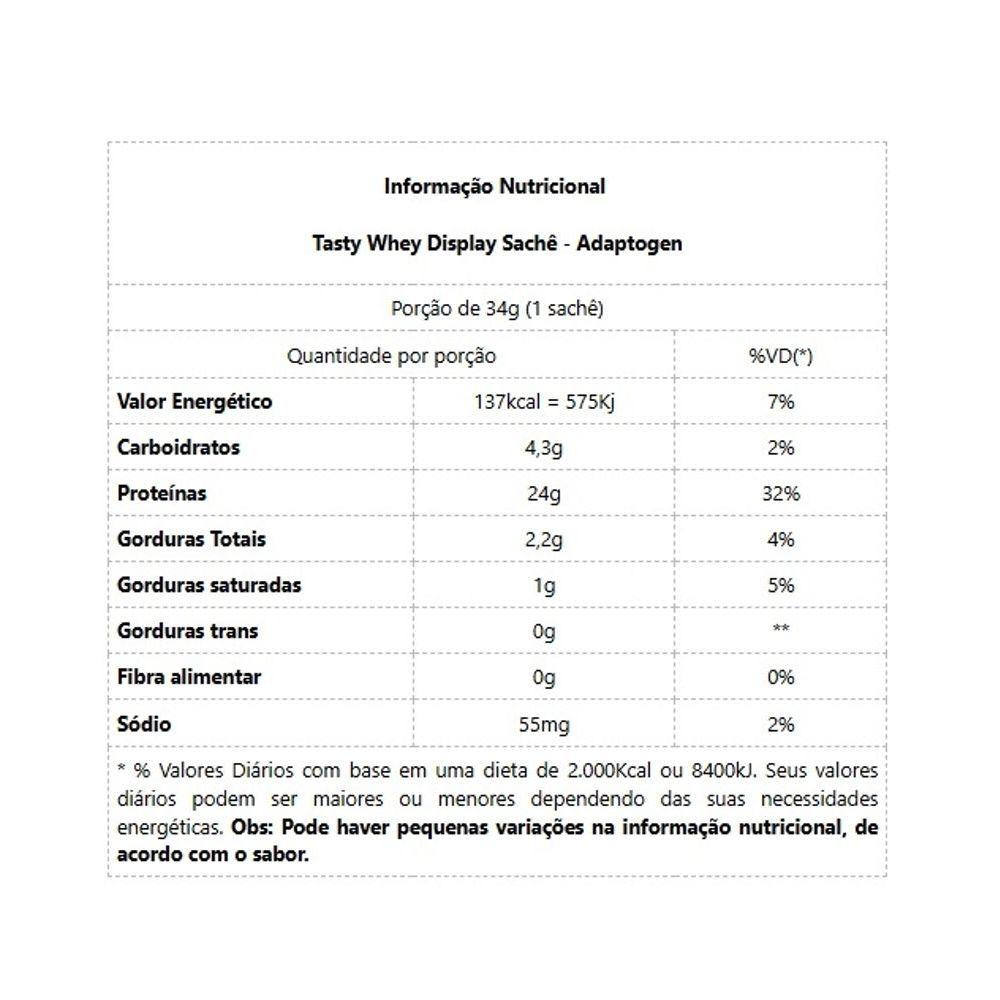 Tasty Whey Sachê - Sabor: Banoffee (32g)Tasty Whey - Adaptogen A premiada Tasty Whey mudou e está ainda melhor, com mais proteína e menos carboidrato, ela possui 24g de proteína, e o melhor, continua a proteína mais saborosa! Com alto valor biológico de excelente absorção; que auxilia no crescimento muscular. É uma ótima opção para quem gosta de criar receitas saudáveis, e por ter a absorção rápida de nutrientes (proteínas e aminoácidos) que o corpo necessita após atividade física intensa, recomenda-se a ingestão logo após o treino. Aprovado pela ANVISA e entrega 100% do que está no rótulo. Todos os produtos da Adaptogen Science passam por rigorosos testes nos EUA antes de serem distribuídos, prática que faz com que os consumidores confiem e atestem a qualidade dos suplementos que estão consumindo. Benefícios: * Altamente saborosa;* 24g de proteína por dose;* Auxilia no reparo a dano tecidual;* Auxilia no ganho de massa muscular;* Ideal para receitas fit;* 5,3g de bcaa;* 2,3g de leucine;* 100% whey protein;* 3,3 g de glutamine.Informação Nutricional Tasty Whey - Adaptogen Sabor: Baunilha Porção de 34g 1 sachêQuantidade por porção%VD(*)Valor Energético137kcal = 575Kj7%Carboidratos4,3g2%Proteínas24g32%Gorduras Totais2,2g4%Gorduras saturadas1g5%Gorduras trans0g**Fibra alimentar0g0%Sódio55mg2%* % Valores Diários com base em uma dieta de 2.000Kcal ou 8400kJ. Seus valores diários podem ser maiores ou menores dependendo das suas necessidades energéticas. Obs: Pode haver pequenas variações na informação nutricional, de acordo com o sabor. Informação Nutricional Tasty Whey - Adaptogen Sabor: ChocolatellaPorção de 36g 1 sachêQuantidade por porção%VD(*)Valor Energético137kcal/575Kj7%Carboidratos4,3g2%Proteínas24g32%Gorduras Totais2,2g4%Gorduras saturadas1g5%Gorduras trans0g**Fibra alimentar0g0%Sódio55mg2%* % Valores Diários com base em uma dieta de 2.000Kcal ou 8400kJ. Seus valores diários podem ser maiores ou menores dependendo das suas necessidades energéticas. Obs: Pode haver pequenas variações na informação nutricional, de acordo com o sabor. Informação Nutricional Tasty Whey - Adaptogen Sabor: CocoPorção de 35g 1 sachêQuantidade por porção%VD(*)Valor Energético137kcal/575Kj7%Carboidratos5,3g2%Proteínas24g32%Gorduras Totais2,2g4%Gorduras saturadas1g5%Gorduras trans0g**Fibra alimentar0g0%Sódio55mg2%* % Valores Diários com base em uma dieta de 2.000Kcal ou 8400kJ. Seus valores diários podem ser maiores ou menores dependendo das suas necessidades energéticas. Obs: Pode haver pequenas variações na informação nutricional, de acordo com o sabor. Informação Nutricional Tasty Whey - Adaptogen Sabor: Leite CondensadoPorção de 35g 1 sachêQuantidade por porção%VD(*)Valor Energético137kcal/575Kj7%Carboidratos5,3g2%Proteínas2,4g32%Gorduras Totais2,2g4%Gorduras saturadas1g5%Gorduras trans0g**Fibra alimentar0g0%Sódio55mg2%* % Valores Diários com base em uma dieta de 2.000Kcal ou 8400kJ. Seus valores diários podem ser maiores ou menores dependendo das suas necessidades energéticas. Obs: Pode haver pequenas variações na informação nutricional, de acordo com o sabor. Informação Nutricional Tasty Whey - Adaptogen Sabor: MorangoPorção de 34g 1 sachêQuantidade por porção%VD(*)Valor Energético137kcal/575Kj7%Carboidratos4,3g2%Proteínas24g32%Gorduras Totais2,2g4%Gorduras saturadas1g5%Gorduras trans0g**Fibra alimentar0g0%Sódio55mg2%* % Valores Diários com base em uma dieta de 2.000Kcal ou 8400kJ. Seus valores diários podem ser maiores ou menores dependendo das suas necessidades energéticas. Obs: Pode haver pequenas variações na informação nutricional, de acordo com o sabor. Informação Nutricional Tasty Whey - Adaptogen Sabor: Mousse de MaracujaPorção de 34g 1 sachêQuantidade por porção%VD(*)Valor Energético137kcal/575Kj7%Carboidratos5,3g2%Proteínas24g32%Gorduras Totais2,2g4%Gorduras saturadas1g5%Gorduras trans0g**Fibra alimentar0g0%Sódio55mg2%* % Valores Diários com base em uma dieta de 2.000Kcal ou 8400kJ. Seus valores diários podem ser maiores ou menores dependendo das suas necessidades energéticas. Obs: Pode haver pequenas variações na informação nutricional, de acordo com o sabor. Informação Nutricional Tasty Whey - Adaptogen Sabor: Dulce de LechePorção de 34g 1 sachêQuantidade por porção%VD(*)Valor Energético137kcal/575Kj7%Carboidratos4,3g2%Proteínas24g32%Gorduras Totais2,2g4%Gorduras saturadas1g5%Gorduras trans0g**Fibra alimentar0g0%Sódio55mg2%* % Valores Diários com base em uma dieta de 2.000Kcal ou 8400kJ. Seus valores diários podem ser maiores ou menores dependendo das suas necessidades energéticas. Obs: Pode haver pequenas variações na informação nutricional, de acordo com o sabor. Informação Nutricional Tasty Whey - Adaptogen Sabor: Banana Porção de 34g 1 sachêQuantidade por porção%VD(*)Valor Energético137kcal/575Kj7%Carboidratos4,3g2%Proteínas24g32%Gorduras Totais2,2g4%Gorduras saturadas1g5%Gorduras trans0g**Fibra alimentar0g0%Sódio55mg2%* % Valores Diários com base em uma dieta de 2.000Kcal ou 8400kJ. Seus valores diários podem ser maiores ou menores dependendo das suas necessidades energéticas. Obs: Pode haver pequenas variações na informação nutricional, de acordo com o sabor. Informação Nutricional Tasty Whey - Adaptogen Sabor: OriginalPorção de 34g 1 sachêQuantidade por porção%VD(*)Valor Energético137kcal/575Kj7%Carboidratos4,3g2%Proteínas24g32%Gorduras Totais2,2g4%Gorduras saturadas1g5%Gorduras trans0g**Fibra alimentar0g0%Sódio55mg2%* % Valores Diários com base em uma dieta de 2.000Kcal ou 8400kJ. Seus valores diários podem ser maiores ou menores dependendo das suas necessidades energéticas. Obs: Pode haver pequenas variações na informação nutricional, de acordo com o sabor. Informação Nutricional Tasty Whey - Adaptogen Sabor: CookiesPorção de 34g 1 sachêQuantidade por porção%VD(*)Valor Energético137kcal/575Kj7%Car