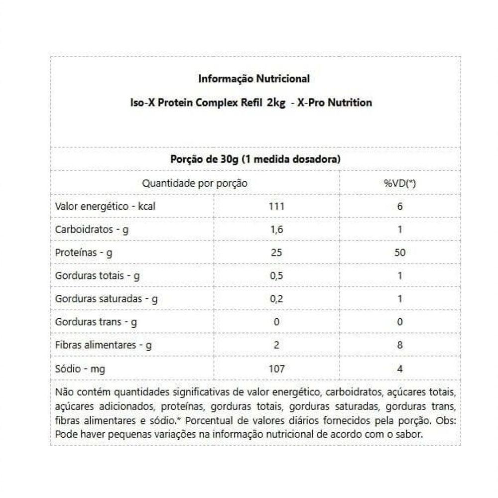 Iso X Protein Complex Refil 2kg Chocolate Whey Isolado X Pro NutritionIso X Protein Complex Refil 2kg Chocolate X Pro Nutrition e um suplemento proteico formulado com whey protein isolado, indicado para quem busca alto aporte de proteinas, rapida absorcao e excelente qualidade nutricional na rotina de treinos e alimentacao. Cada porcao fornece aproximadamente 25g de proteinas, contribuindo para o suporte ao consumo diario de proteinas, manutencao e desenvolvimento da massa muscular e melhor aproveitamento nutricional. Apresenta baixo teor de carboidratos, boa digestibilidade e solubilidade, sendo ideal para consumo no pos treino, entre refeicoes ou conforme necessidade diaria. O sabor chocolate equilibrado proporciona melhor experiencia de consumo, atendendo atletas e praticantes de atividade fisica que buscam praticidade, desempenho e custo beneficio.PRINCIPAIS DIFERENCIAISContem whey protein isolado do soro do leiteAproximadamente 25g de proteinas por doseRapida absorcao e boa digestibilidadeBaixo teor de carboidratosBoa solubilidadeSabor chocolate equilibradoIdeal para uso diario e pos treinoExcelente custo beneficioInformação Nutricional Iso-X Protein Complex Refil 2kg- X-Pro NutritionPorção de 30g (1 medida dosadora)Quantidade por porção%VD(*)Valor energético - kcal1116Carboidratos - g1,61Proteínas - g2550Gorduras totais - g0,51Gorduras saturadas - g0,21Gorduras trans - g00Fibras alimentares - g28Sódio - mg1074Não contém quantidades significativas de valor energético, carboidratos, açúcares totais, açúcares adicionados, proteínas, gorduras totais, gorduras saturadas, gorduras trans, fibras alimentares e sódio.* Porcentual de valores diários fornecidos pela porção. Obs: Pode haver pequenas variações na informação nutricional de acordo com o sabor.