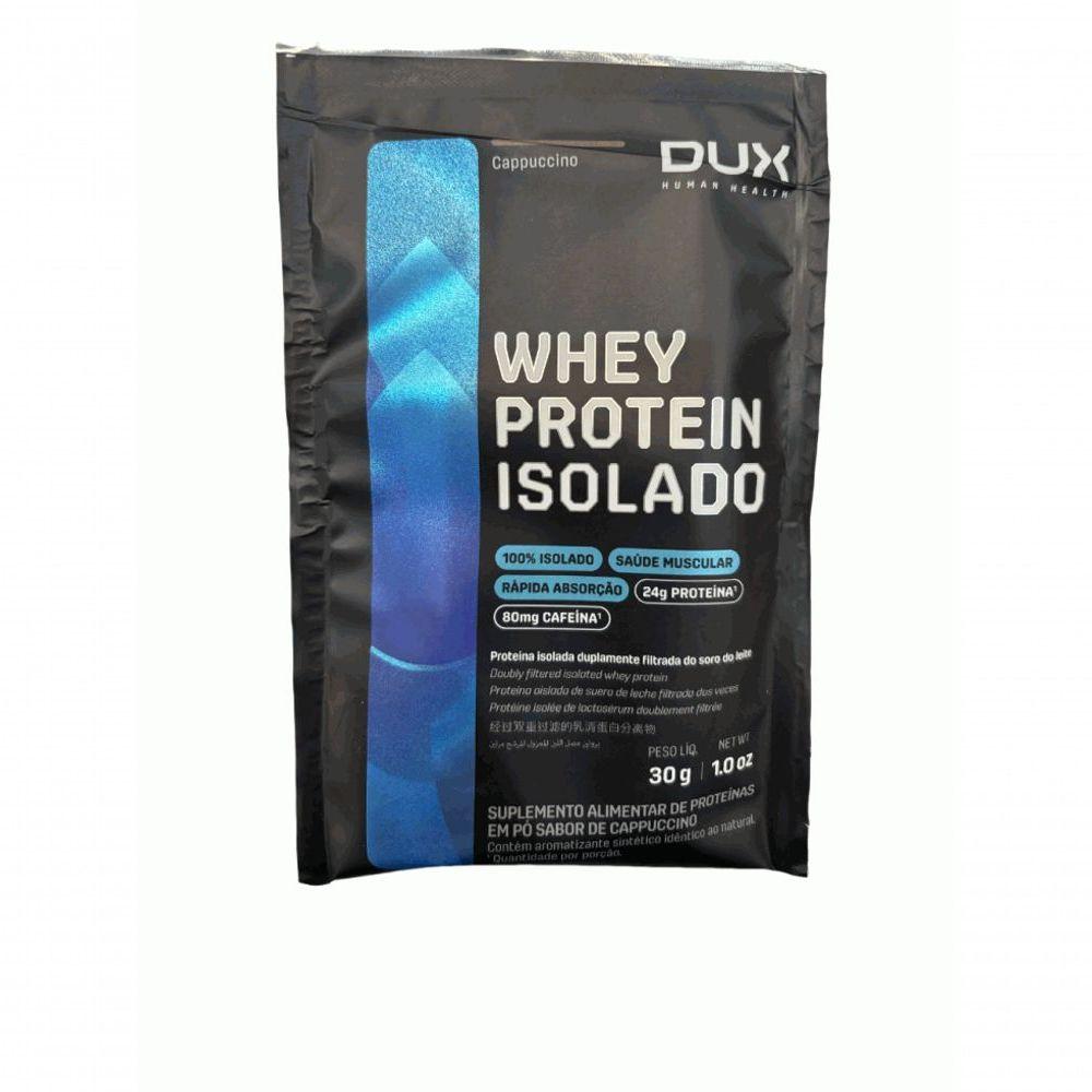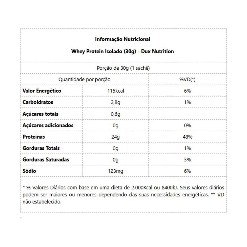 Whey Protein Isolado Sachê - Sabor: Cappuccino (30g)Whey Protein Isolado Sachê O Whey Protein Isolado Dux Nutrition possui baixo teor de gorduras e carboidratos, sendo ideal para construção e recuperação muscular sem perda de definição, como um snack fit prático ou sem culpa em suas receitas. Uma proteína 100% pura, duplamente filtrada, sem adição de outro tipo de Whey ou de proteínas inferiores. Se há um nutriente indispensável, é a proteína. Ela é feita de aminoácidos, que são os blocos de construção do nosso corpo. A proteína do soro do leite, em inglês “Whey Protein”, é uma das fontes de aminoácidos de melhor absorção, maior até que o frango ou peixe. Isso torna o Whey uma forma conveniente de ingerir proteína, melhorando a saúde, o bem-estar e os resultados dos treinos. BENEFÍCIOS: * Matéria-prima premium importada, obtida através do processo de extração de microfiltragem, sem renunciar do sabor real das nossas proteínas;* Aporte completo de aminoácidos: 6,2g de BCAAs; 4,7g de glutamina e 2,9g de leucina, por dose;* 24g de proteína;* Disponível em versões sem adoçantes artificiais, 100% naturais;* O nome diz tudo: Whey Protein Isolado 100% puro, com transparência total, do nome do produto à lista de ingredientes;* Não contém goma xantana, complexos vitamínicos à base de maltodextrina, espessantes, estabilizantes, conservantes ou qualquer outro ingrediente inferior;* Proteína moderna, desenvolvida por especialistas para atletas de esportes de performance (bodybuilding, crossfit e artes marciais), pessoas que buscam uma proteína com baixa caloria (para snacks fit e receitas sem culpa) e pessoas que buscam uma proteína ultrapura de altíssima qualidade;* Contém corantes 100% naturais, sem ingredientes artificiais. Informação Nutricional Whey Protein Isolado (30g) - Dux Nutrition - Sabor CookiesPorção de 30g (1 sachê)Quantidade por porção%VD(*)Valor Energético115kcal6%Carboidratos2,8g1%Açúcares totais0,6g Açúcares adicionados0g0%Proteínas24g48%Gorduras Totais0g1%Gorduras Saturadas0g3%Sódio123mg6%* % Valores Diários com base em uma dieta de 2.000Kcal ou 8400kJ. Seus valores diários podem ser maiores ou menores dependendo das suas necessidades energéticas. ** VD não estabelecido. Informação Nutricional Whey Protein Isolado (28g) - Dux Nutrition - Sabor NeutroPorção de 28g (1 sachê)Quantidade por porção%VD(*)Valor Energético105kcal6%Carboidratos2,8g1%Açúcares totais0,6g Proteínas24g48%Gorduras Totais0,6g1%Gorduras Saturadas0,3g3%Sódio118mg6%Não contém quantidades significativas de açúcares adicionados, gorduras trans e fibras alimentares. * Percentual de valores diários fornecidos pela porção. Informação Nutricional Whey Protein Isolado (28g) - Dux Nutrition - Sabor CocoPorção de 28g (1 sachê)Quantidade por porção%VD(*)Valor Energético107kcal6%Carboidratos1,5g1%Açúcares totais0,6g Proteínas24g48%Gorduras Totais0,6g1%Gorduras Saturadas0,3g3%Sódio118mg6%Não contém quantidades significativas de gorduras trans e fibras alimentares. * Percentual de valores diários fornecidos pela porção. Informação Nutricional Whey Protein Isolado (30g) - Dux Nutrition - Sabor Doce de LeitePorção de 30g (1 sachê)Quantidade por porção%VD(*)Valor Energético108kcal6%Carboidratos1,6g1%Açúcares totais0,7g Açúcares adicionados0g Proteínas24g48%Gorduras Totais0,6g1%Gorduras Saturadas0,4g3%Sódio125mg6%Não contém quantidades significativas de gorduras trans e fibras alimentares. * Percentual de valores diários fornecidos pela porção. Informação Nutricional Whey Protein Isolado (30g) - Dux Nutrition - Sabor CappuccinoPorção de 30g (1 sachê)Quantidade por porção%VD(*)Valor Energético112kcal6%Carboidratos2,2g1%Açúcares totais0,6g Açúcares adicionados0g0%Proteínas24g48%Gorduras Totais0,81%Gorduras Saturadas0,3g2%Fibras alimentares0,6g2%Sódio118mg6%Cafeína80mg Não contém quantidades significativas de gorduras trans e fibras alimentares. * Percentual de valores diários fornecidos pela porção.