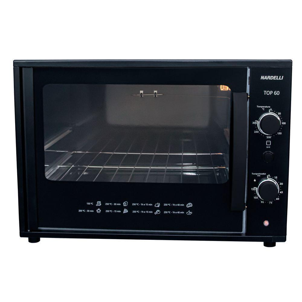 Forno Eletrico Nardelli 60L Top 60 1750W Preto 110VQuando o assunto é forno, a Nardelli dá um show com 60 litros, o forno Top60 é prático, moderno e inteligente. Ele deixa sua cozinha ainda mais elegante, possui timer de 120 minutos, possibilitando uma programação eficaz para seus pratos.O controle de temperatura é automático e varia de 0 C a 300 c, além de possuir o dourador, que doura seus alimentos e os deixa com aspecto muito saboroso. Grande parte de seu interior é Easy Clean, não é autolimpante, mas é um esmalte resistente. Tudo isso, inspirado em você.CaracterísticasMarca: NardelliModelo: Top 60 BlackVoltagem: 127VCor: PretoCapacidade: 60 LitrosTimer até 120 minutosTipo de Forno: BancadaDesign ExclusivoAbertura da Porta: LateralPainel: ManualOpção Grill / DouradorCompacto, prático e modernoLuz piloto: Que indica se o forno está ligadoLuz interna (Lâmpada com protetor)Interior Easy Clean (Esmaltado)Termostato: Permite escolher a temperatura desejada até 300°CControle Automático de Temperatura: Mantem a temperatura escolhidaIsolamento térmicoBandeja para resíduosPés antiderrapantesFrequência: 60 HzPotência resist. Sup.: 750 WPotência resist. Inf.: 1000 WPotência total: 1750 WConsumo: 1,2 kWhDimensões externas aproximadas do produto (LxAxP): 57 cm x 41 cm x 45 cmDimensões internas aproximadas do produto (LxAxP): 45 cm x 35 cm x 37 cmPeso Aproximado: 11,5 kgImportante: Imprescindível à conferência no ato da . Em caso de anormalidade, recuse o .A tonalidade do produto pode variar entre a imagem de exibição e o item físico, por conta do tratamento de imagens e a calibração de cores da sua tela.Todas as informações divulgadas são de responsabilidade do fabricante, podendo sofrer alterações sem nenhum aviso prévio.Garantia de 12 meses contra de fabricação, de acordo com as normas do fabricante., , lacrado e acompanha .Forno Eletrico Nardelli 60L Top 60 1750W Preto 127V