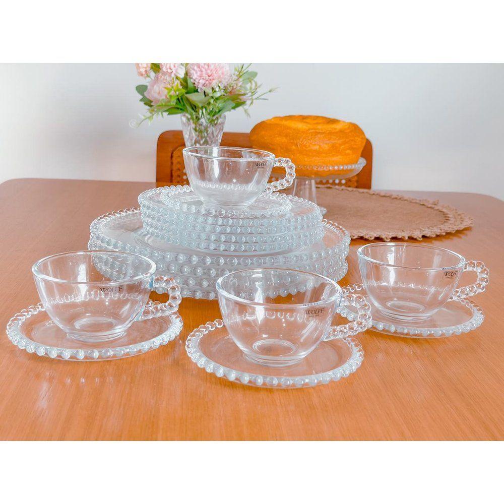 Kit 4 Xícaras Com Pires + 4 Pratos Sobremesa + 4 Pratos Jantar Pearl Wolff TransparenteO Kit 4 Xícaras com Pires + 4 Pratos Sobremesa + 4 Pratos Jantar Pearl Wolff tem beleza e sofisticação inigualáveis. Possui borda com delicadas bolinhas e transparência incrível, permitindo fazer várias combinações com outras louças. Além de tudo ficam lindos com roupas de mesa estampadas e coloridas.A Wolff, tradicional e renomada marca alemã fundada em 1894, teve seus direitos de fabricação adquiridos pelo Grupo Rojemac em 2002 e se consolidou no mercado de artigos de luxo. Nossos produtos são originais da Wolff, sendo que as embalagens originais acompanham o produto. Não aceite imitações!Estoque limitado, compre agora e não fique sem!Características Gerais do Produto:- Composição: 4 Xícaras | 4 Pires | 4 Pratos Sobremesa | 4 Pratos Jantar- Material: Cristal; Vidro- Informações Adicionais: Não usar no micro-ondas | Não usar na Lava Louças- Dimensões: Xícaras: 180 ml (grande) 5,5 cm x Ø 9 cm e Pires: Ø 13 cm | Prato Sobremesa: 20 cm | Prato Raso: 28 cmGarantia:- Garantia contra Defeitos