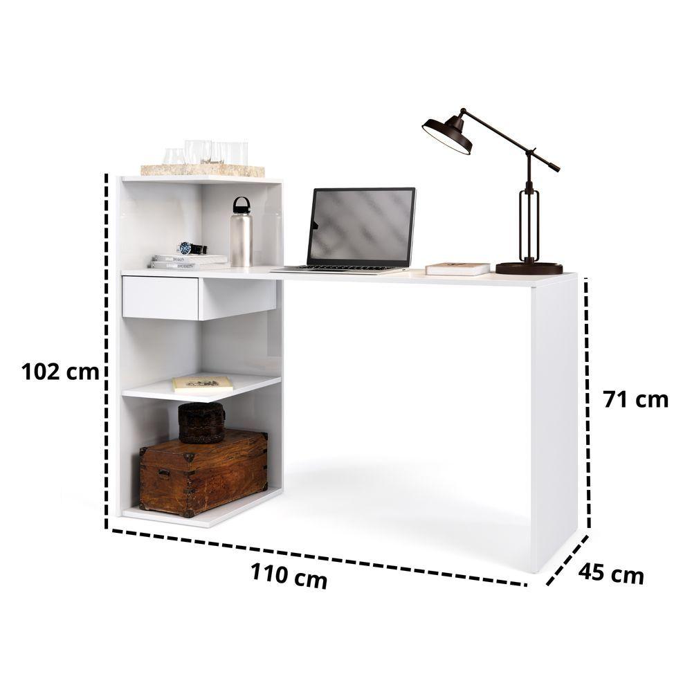 Mesa Escrivaninha Euro Para Home Office E Quarto Com Gaveta E PrateleirasA Mesa Escrivaninha Euro é um móvel útil, versátil e multifuncional, perfeito para complementar o seu ambiente. Possui um design atual que facilita na hora da composição da decoração, proporcionando um espaço mais organizado e aconchegante. Possui tampo espaçoso, ótimo para trabalho home office e estante nicho para armazenar seu material ou decoração.ESPECIFICAÇÕES TÉCNICASESCRIVANINHAAltura: 102 cmLargura: 110 cmProfundidade: 45 cmITENS INCLUSOS1 Escrivaninha Euro.1 ManualOBSERVAÇÕES IMPOTANTES- Produto para uso residencial em ambiente interno, não devendo ficar exposto diretamente ao sol, calor e umidades excessivas.- Pode haver alguma diferença de tonalidade entre a imagem e o produto real, por conta do tratamento de imagens e a calibração de cores do seu monitor.- As imagens são meramente ilustrativas.- Não acompanham objetos de decoração e eletrônicos.- Confira as dimensões do produto e certifique-se de que passará normalmente por supostos elevadores, portas, escadas e/ou corredores de sua residência.- Não nos responsabilizamos pela montagem dos produtos. Não arcamos com custos de montagem.- A montagem deste produto é de responsabilidade exclusiva do cliente. A empresa não se responsabiliza por montagens incorretas, danificadas ou incompletas realizadas pelo cliente ou por terceiros contratados por ele.- A garantia são de 3 meses legais.;