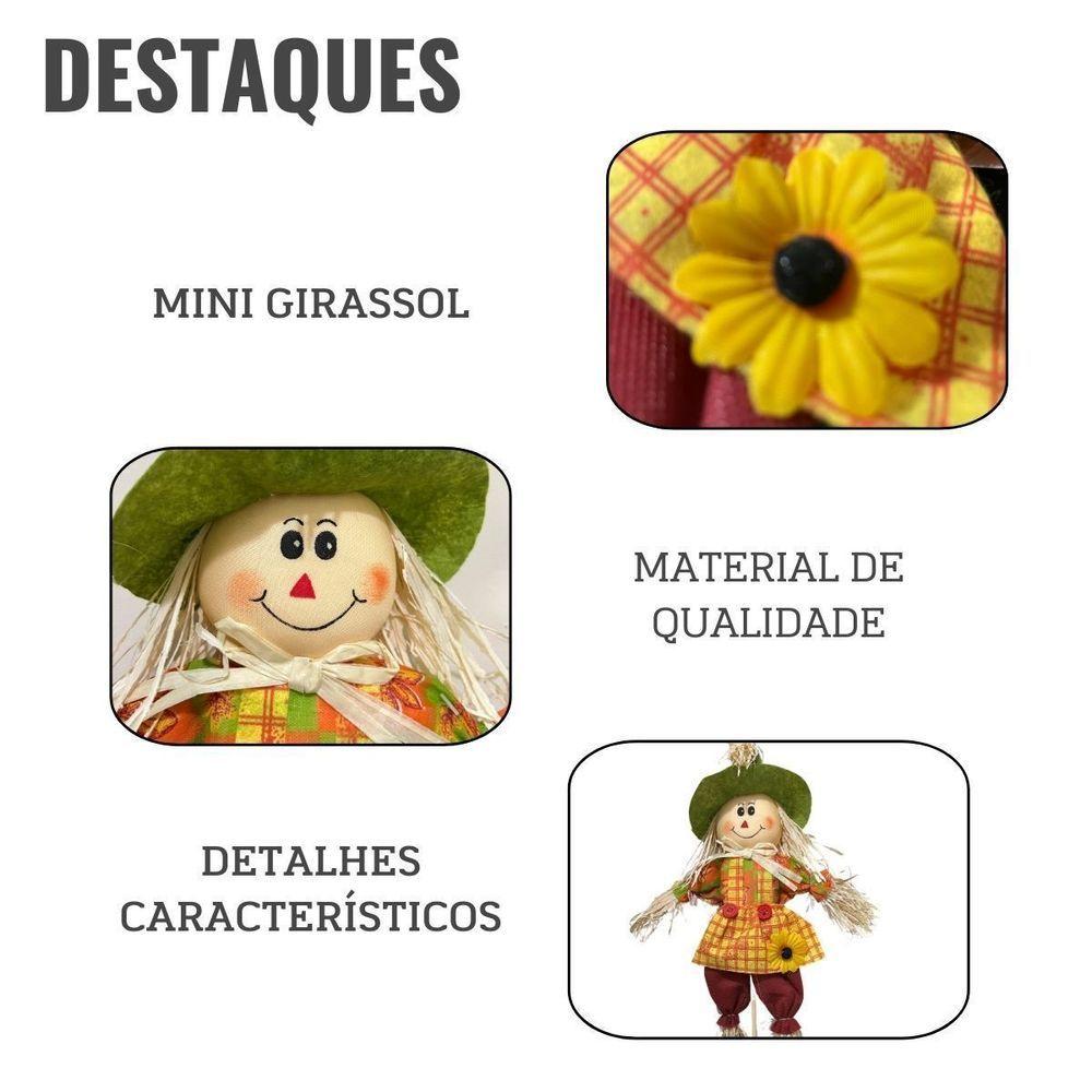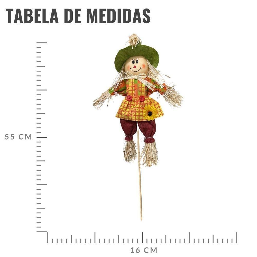 Boneco Espantalho Para Enfeite De Jardim De Festa JuninaEspantalho Junino Enfeite de Jardim de Festa JuninaO Boneco Espantalho é a escolha perfeita para quem busca um toque especial na decoração de festas juninas. Produzido com materiais de alta qualidade, sua estrutura resistente garante que ele se mantenha firme e bonito durante todo o evento. Com um design rústico e colorido, este espantalho não apenas é um enfeite, mas também um símbolo da cultura junina, trazendo alegria e diversão para todos os convidados.Diferenciais:Design vibrante e atraente, ideal para crianças e adultos.Feito de material leve e durável, facilitando a montagem e o transporte.Possui uma aplicação versátil, podendo ser utilizado em mesas, buffets ou até mesmo como parte da decoração de ambientes.Mais sobre o Produto:Este boneco espantalho é mais do que apenas um enfeite; ele traz a essência das festas juninas para dentro da sua casa, proporcionando momentos de alegria e descontração. Suas dimensões de 52 cm permitem que ele seja facilmente posicionado em qualquer mesa, seja em uma festa grande ou em uma reunião mais íntima. Seja em um arraial, um piquenique ou uma simples confraternização, o Boneco Espantalho Junino é uma maneira de celebrar a tradição e a convivialidade.Dicas de Uso:Combine o boneco espantalho com outras decorações típicas, como bandeirinhas, balões e toalhas xadrez, para criar um ambiente ainda mais festivo.Use-o como parte de um centro de mesa, acompanhando pratos típicos da culinária junina, como canjica e pamonha.Personalize o espantalho com pequenos acessórios, como chapéus de palha ou lenços, para deixá-lo ainda mais especial e único.Ficha Técnica:Marca: Extra FestasModelo: JuninoTamanho: 52cmQuantidade por embalagem: 1 unidadeCor: MulticoloridoMaterial: Tecido e PlásticoNão perca a oportunidade de encantar seus convidados e fazer da sua festa junina um evento inesquecível. Adquira agora seu Boneco Espantalho e traga o verdadeiro espírito das festas juninas para a sua celebração!Transforme qualquer ocasião em um momento especial! Fantasias, acessórios e decorações para festas de aniversário, Páscoa, Festa Junina, Halloween, Carnaval e eventos temáticos. Compre agora e receba com rapidez e praticidade!