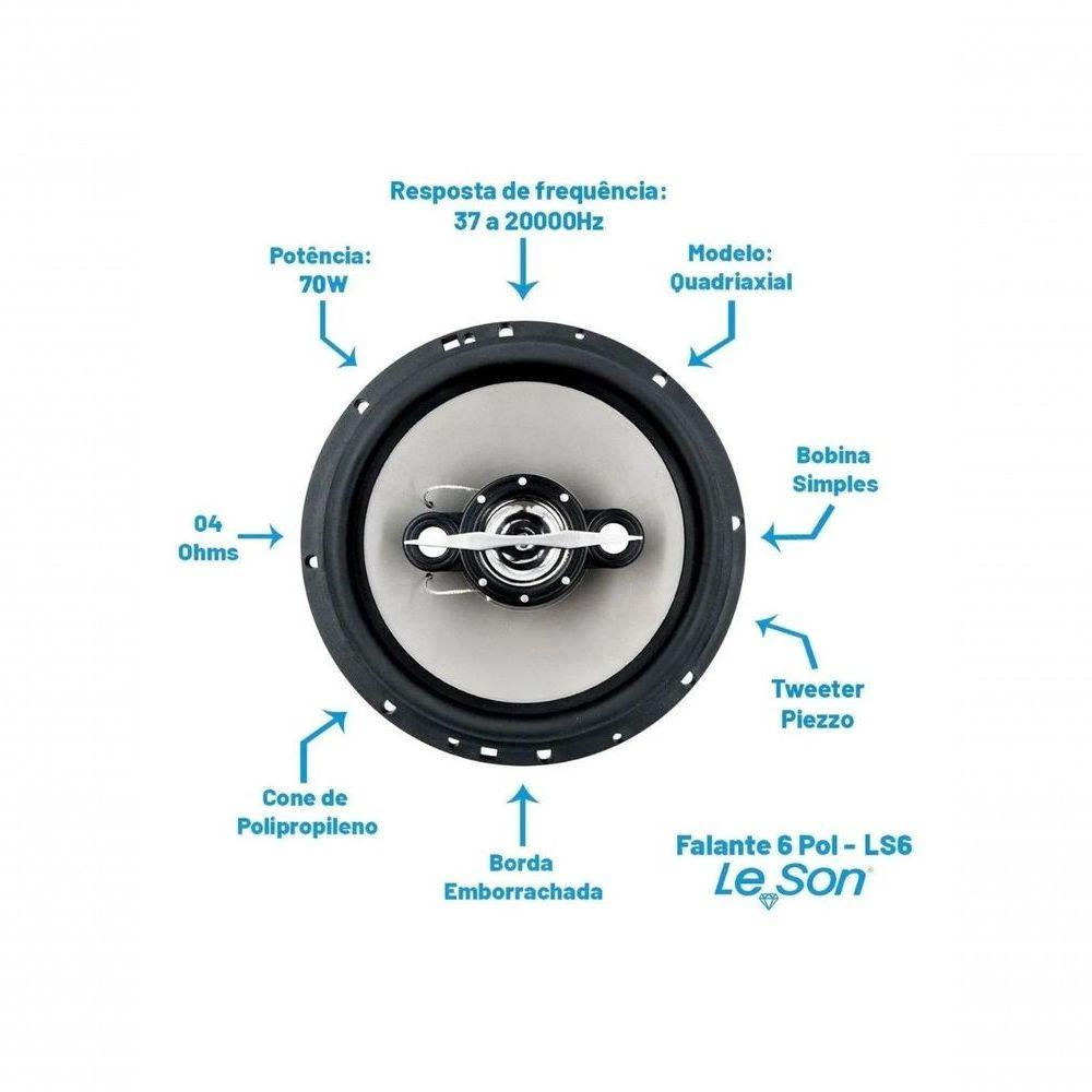 Kit Alto Falante Leson Ls60 70w 4 OhEsqueça o som fraco e sem graça no seu carro! Com o Kit Alto Falante Leson Ls60 70W 4 Ohms, você irá experimentar uma qualidade sonora superior que vai transformar sua experiência ao volante. Cada alto-falante entrega impressionantes 70W RMS de potência, proporcionando graves fortes e cristalinos tons altos.Feitos com um cone de polipropileno PP e borda emborrachada, os Leson Ls60 garantem alta durabilidade e resistência contra tensões. Sua sensibilidade de 87Db proporciona uma sonorização poderosa, mesmo com amplificadores de menor potência. A resposta de frequência de 37 a 20000Hz distribui som natural e completo, para acompanhar qualquer gênero musical com riqueza de detalhes.O design moderno e discreto dos alto-falantes Leson se adapta perfeitamente às portas do seu carro, proporcionando uma instalação fácil e estética. Conecte-se com a música de uma forma mais imersiva e viva a verdadeira experiência sonora dentro do seu veículo. Aproveite o som de alta qualidade que você merece: adquira agora o Kit Alto Falante Leson Ls60 e domine o ritmo da estrada!Esqueça o som fraco e sem graça no seu carro! Com o Kit Alto Falante Leson Ls60 70W 4 Ohms, você irá experimentar uma qualidade sonora superior que vai transformar sua experiência ao volante. Cada alto-falante entrega impressionantes 70W RMS de potência, proporcionando graves fortes e cristalinos tons altos.Feitos com um cone de polipropileno PP e borda emborrachada, os Leson Ls60 garantem alta durabilidade e resistência contra tensões. Sua sensibilidade de 87Db proporciona uma sonorização poderosa, mesmo com amplificadores de menor potência. A resposta de frequência de 37 a 20000Hz distribui som natural e completo, para acompanhar qualquer gênero musical com riqueza de detalhes.O design moderno e discreto dos alto-falantes Leson se adapta perfeitamente às portas do seu carro, proporcionando uma instalação fácil e estética. Conecte-se com a música de uma forma mais imersiva e viva a verdadeira experiência sonora dentro do seu veículo. Aproveite o som de alta qualidade que você merece: adquira agora o Kit Alto Falante Leson Ls60 e domine o ritmo da estrada!