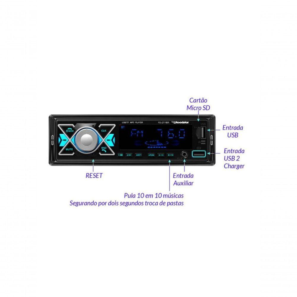 Auto Radio Roadstar Bluetooth - Rs2714br PlusDescubra a praticidade e a tecnologia do Auto Rádio Roadstar Bluetooth RS-2714BR Plus, o companheiro ideal para suas viagens e trajetos diários. Com um design moderno e funcional, este auto rádio oferece tudo o que você precisa para transformar sua experiência ao volante em algo realmente especial. Uma das maiores novidades deste modelo é a presença de duas entradas USB frontais que proporcionam máxima conveniência: você pode recarregar seu celular enquanto escuta sua playlist favorita, garantindo praticidade e eficiência sem comprometer o seu tempo ou sua diversão.A conectividade é um dos grandes destaques do RS-2714BR Plus. Além de contar com conexão Bluetooth para você reproduzir músicas diretamente do seu smartphone, o auto rádio também possui entrada auxiliar frontal, entrada para cartão micro SD e duas entradas USB dedicadas: uma para recarregar dispositivos e outra para reproduzir arquivos de áudio a partir de um pen drive. Essa combinação de opções permite que você escolha a melhor forma de aproveitar suas músicas e podcasts, sem complicações.O painel fixo com botões iluminados em azul e o visor LED branco oferecem uma interface intuitiva e elegante, facilitando o uso mesmo em condições de pouca luz. O rádio FM integrado conta com memória para até 18 estações, garantindo que você tenha sempre ao alcance os seus canais favoritos. Para quem gosta de personalização sonora, os controles de graves, agudos e balanço dos canais permitem ajustar o áudio de acordo com suas preferências, tornando a experiência ainda mais imersiva.Equipado com 4 saídas RCA e potência de 55 Watts RMS por canal, o RS-2714BR Plus entrega qualidade sonora impressionante, ideal para quem busca um som potente e claro. Para maior comodidade, o modelo inclui controle remoto físico e também permite operação via aplicativo, oferecendo flexibilidade para ajustar o aparelho sem precisar tocar diretamente no painel.Descubra a praticidade e a tecnologia do Auto Rádio Roadstar Bluetooth RS-2714BR Plus, o companheiro ideal para suas viagens e trajetos diários. Com um design moderno e funcional, este auto rádio oferece tudo o que você precisa para transformar sua experiência ao volante em algo realmente especial. Uma das maiores novidades deste modelo é a presença de duas entradas USB frontais que proporcionam máxima conveniência: você pode recarregar seu celular enquanto escuta sua playlist favorita, garantindo praticidade e eficiência sem comprometer o seu tempo ou sua diversão.A conectividade é um dos grandes destaques do RS-2714BR Plus. Além de contar com conexão Bluetooth para você reproduzir músicas diretamente do seu smartphone, o auto rádio também possui entrada auxiliar frontal, entrada para cartão micro SD e duas entradas USB dedicadas: uma para recarregar dispositivos e outra para reproduzir arquivos de áudio a partir de um pen drive. Essa combinação de opções permite que você escolha a melhor forma de aproveitar suas músicas e podcasts, sem complicações.O painel fixo com botões iluminados em azul e o visor LED branco oferecem uma interface intuitiva e elegante, facilitando o uso mesmo em condições de pouca luz. O rádio FM integrado conta com memória para até 18 estações, garantindo que você tenha sempre ao alcance os seus canais favoritos. Para quem gosta de personalização sonora, os controles de graves, agudos e balanço dos canais permitem ajustar o áudio de acordo com suas preferências, tornando a experiência ainda mais imersiva.Equipado com 4 saídas RCA e potência de 55 Watts RMS por canal, o RS-2714BR Plus entrega qualidade sonora impressionante, ideal para quem busca um som potente e claro. Para maior comodidade, o modelo inclui controle remoto físico e também permite operação via aplicativo, oferecendo flexibilidade para ajustar o aparelho sem precisar tocar diretamente no painel.