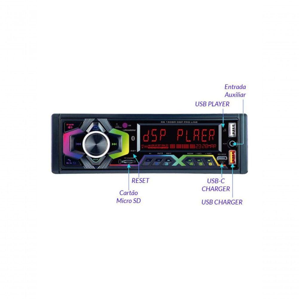 Auto Radio Roadstar Rs150br Am/fm Bluetooth Dsp Pro LineExperimente a fusão perfeita entre tecnologia avançada e qualidade sonora incomparável com o Auto Rádio Roadstar RS150BR AM/FM Bluetooth DSP Pro Line. Este modelo foi desenvolvido para quem busca modernidade e desempenho superior, oferecendo um processador DSP integrado que eleva a experiência musical ao próximo nível. Com ajuste de equalização em até 40 bandas de frequência, você terá controle absoluto sobre os graves, agudos e balança dos canais, além de contar com saídas de Low Pass, High Pass, SubWoofer e 3D surround, garantindo um som imersivo e potente, ideal para os apaixonados por áudio de alta qualidade.A conectividade do RS150BR DSP Pro Line é outro destaque que o torna indispensável. Equipado com Bluetooth 5.0, entrada auxiliar frontal, acesso para cartão Micro SD, duas portas USB — sendo uma para reprodução e outra para recarga — e uma porta USB-C para carregamento rápido, este auto rádio é a solução completa para manter todos os seus dispositivos conectados e carregados, incluindo smartphones, tablets e até computadores. Com saídas RCA de 4V e duas saídas RCA exclusivas para SubWoofers, você garantirá uma performance de áudio incrível, com potência e clareza em cada detalhe.Controle total e praticidade estão ao seu alcance com o RS150BR. O aparelho vem acompanhado de um controle remoto físico e é compatível com controle via aplicativo AUTO DSP, disponível na APP STORE e no GOOGLE PLAY. Além disso, sua conexão com comando de volante facilita o acesso às funções enquanto você dirige, proporcionando uma experiência intuitiva e segura. Com painel fixo e botões em RGB, visor LCD de alta nitidez e memória para armazenar até 18 estações FM e 12 AM, este auto rádio combina funcionalidade e estilo em um único equipamento.Experimente a fusão perfeita entre tecnologia avançada e qualidade sonora incomparável com o Auto Rádio Roadstar RS150BR AM/FM Bluetooth DSP Pro Line. Este modelo foi desenvolvido para quem busca modernidade e desempenho superior, oferecendo um processador DSP integrado que eleva a experiência musical ao próximo nível. Com ajuste de equalização em até 40 bandas de frequência, você terá controle absoluto sobre os graves, agudos e balança dos canais, além de contar com saídas de Low Pass, High Pass, SubWoofer e 3D surround, garantindo um som imersivo e potente, ideal para os apaixonados por áudio de alta qualidade.A conectividade do RS150BR DSP Pro Line é outro destaque que o torna indispensável. Equipado com Bluetooth 5.0, entrada auxiliar frontal, acesso para cartão Micro SD, duas portas USB — sendo uma para reprodução e outra para recarga — e uma porta USB-C para carregamento rápido, este auto rádio é a solução completa para manter todos os seus dispositivos conectados e carregados, incluindo smartphones, tablets e até computadores. Com saídas RCA de 4V e duas saídas RCA exclusivas para SubWoofers, você garantirá uma performance de áudio incrível, com potência e clareza em cada detalhe.Controle total e praticidade estão ao seu alcance com o RS150BR. O aparelho vem acompanhado de um controle remoto físico e é compatível com controle via aplicativo AUTO DSP, disponível na APP STORE e no GOOGLE PLAY. Além disso, sua conexão com comando de volante facilita o acesso às funções enquanto você dirige, proporcionando uma experiência intuitiva e segura. Com painel fixo e botões em RGB, visor LCD de alta nitidez e memória para armazenar até 18 estações FM e 12 AM, este auto rádio combina funcionalidade e estilo em um único equipamento.