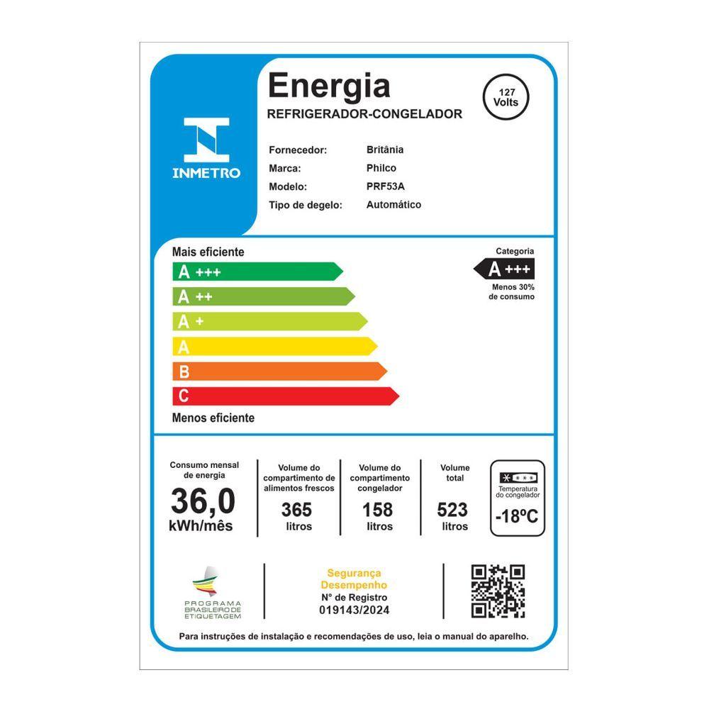 Geladeira 523L Philco Eco Inverter French Door Inox PRF53A 110VA Geladeira 523L Inverter Frost Free Philco PRF53A é a solução perfeita para famílias que buscam praticidade e eficiência no dia a dia. Com capacidade de 523 litros, sendo 365L no refrigerador e 158L no freezer, a PRF53A oferece espaço de sobra para armazenar todos os seus alimentos. A tecnologia Frost Free evita o acúmulo de gelo, poupando seu tempo e esforço. O sistema Smart Cooling do Refrigerador Frost Free distribui a temperatura uniformemente, mantendo seus alimentos frescos por mais tempo. Além disso, os sensores inteligentes do Smart Sensor evitam quedas de temperatura, melhorando o resfriamento do freezer em até 20%. Aproveite as funções Eco e Turbo para ajustar o consumo de energia e a iluminação interna em LED para garantir a visibilidade perfeita sem gerar calor, ideal para suas festas. Adquira agora a Geladeira 523L Frost Free Philco PRF53A e eleve sua experiência culinária a um novo patamar. - Tipo de Compressor: Eco Inverter- Capacidade Refrigerador: 365 litros- Capacidade Freezer: 158 litros- Controle de temperatura individuais- Controle de temperatura Digital: Possui 3 níveis, mínimo, médio e máximo- Divisão do Refrigerador: 2 gavetas individuais, 6 prateleiras nas portas e 3 prateleiras de vidro no refrigerador- Divisão do Freezer: 2 gavetas- Classificação Energética: Classe A+++- Tipo de Iluminação interna: Led- Sistema de refrigeração Cycle Defrost- Sistema de refrigeração Frost Free- Temperatura do refrigerador: 3 estágios, mínimo 2°C e máximo 8°C- Temperatura do frezeer: 3 estágios, mínimo -24°C e máximo -16°C- Porta em aço com tratamento anti-corrosão- Tipo de prateleiras: Vidro temperado- Quantidade de prateleiras: 3 no Refrigerador- Pés niveladores: 2 na parte frontal- Alarme de porta aberta- Capacidade total: 523 litros no total- Tensão/Hz: 127V 60Hz e 220V 60Hz- Painel Touch- Rodízios para descolamento.Especificações Técnicas:Marca: PhilcoModelo: PFR53AFunções: Eco, Turbo e Smart CoolingClassificação Energética: A+++Temperatura Freezer:24°C a:16°CTemperatura Refrigerador: 2°C a 8°CPrateleiras: Em vidro temperadoEstado: NovoRegulamentações de produtos perigosos: Não se aplicaDivisão do refrigerador: 2 gavetas individuais, 6 prateleiras nas portas e 3 prateleiras de vidro no refrigeradorDivisão do freezer: 2 gavetasCapacidade: 523LTipo: French Door: 2 portas e 1 gavetaTecnologia: Smart Cooling Frost Free Alarme de porta Painel touchTipo de alimentação: Energia ElétricaCompressor: Eco InverterCom freezer: SimÁgua na Porta: NãoCor: InoxÉ frigobar: NãoAltura do produto: 168,5 cmLargura do produto: 74,4 cmComprimento do produto: 74,5 cmPeso do produto: 79,5 kgAltura com embalagem: 177,2 cmLargura com embalagem: 77,7 cmComprimento com embalagem: 82,8 cmPeso com embalagem: 87,5 kgGarantia (Dias): 360Observação: Somente faturamos para o nosso consumidor final, ou seja, não faturamos pedidos para CNPJ por este portal de vendas;