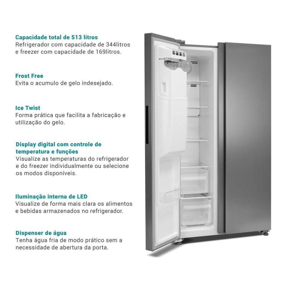 Geladeira 513l Philco Side By Side Inverter Prf613id 220vA Geladeira 513L Philco Side By Side Inverter PRF613ID é uma solução inteligente para quem busca praticidade e eficiência no armazenamento de alimentos.Com um design Side by Side, ela otimiza o espaço ao colocar o freezer e o refrigerador lado a lado, proporcionando uma capacidade generosa de 513 litros. Equipada com um dispenser de água e gelo, dispensa a necessidade de abrir a porta da geladeira para desfrutar de água fria ou gelo em cubos ou triturado, conforme a preferência.Já o sistema Smart Cooling distribui uniformemente a temperatura por todo o interior da geladeira e do freezer, garantindo a conservação homogênea dos alimentos. O compressor Eco Inverter não só oferece uma maior economia de energia, mas também trabalha silenciosamente, prolongando a vida útil do aparelho.O display digital e o controle de temperatura permitem acompanhar e ajustar as configurações conforme necessário, incluindo as temperaturas individuais do refrigerador e do freezer, bem como as funções disponíveis.Com 4 modos de operação diferentes - Smart, Eco, Turbo Refrigeração e Turbo Congelamento – essa Geladeira oferece flexibilidade para atender às necessidades do usuário. Para armazenar seus alimentos e bebidas sem se preocupar com espaço, conte com o Refrigerador/Geladeira Philco PRF613ID Side By Side 513L.Capacidade de 513L (344L no refrigerador e 169L no freezer)Classificação A+++ em eficiência energéticaSistema de refrigeração Frost FreePainel touch com display LCDControle de temperatura do freezer e refrigerador de forma independenteFreezer com temperaturas de -14°C a -22°C (turbo freezer -25°C)Refrigerador com temperaturas de 2 a 8°CFunções Eco, férias, turbo freezer e turbo refrigeradorAlarme de porta abertaÁgua e gelo na portaFiltro de água com vida útil de 3785L ou 6 mesesFabricador de gelo automático (em cubos ou triturado)Porta em aço com tratamento anti-corrosãoPuxador embutido nas portasPrateleiras em vidro temperadoIluminação interna LEDCompressor Inverter proporcionando mais economia.Garantia (Dias) - 360Modelo - PRF613IDFunções - Smart, Eco, Turbo Refrigeração e Turbo CongelamentoClassificação Energética - A+++Temperatura Freezer - -14°C a -22°C (turbo freezer -25°C)Temperatura Refrigerador - SimPrateleiras - vidro temperadoEstado - NovoOBSERVACAO - Somente faturamos para o nosso consumidor final, ou seja, não faturamos pedidos para CNPJ por este portal de vendas;officialstoreid_meli - 199Regulamentações de produtos perigosos - Não se aplicaMarca - PhilcoDivisão do refrigerador - 344LDivisão do freezer - 169LCapacidade - 513LTipo - Side by Side - 2 PortasTecnologia - Smart Cooling Frost Free Display digital Painel touch Alarme de portameli_shipping_mode - me1Tipo de alimentação - Energia ElétricaAcessórios - Manual do Consumidor e Conjunto de gelo Ice TwistCompressor - InverterCom freezer - SimÁgua na Porta - SimCor - InoxManual de Instruções - https://britaniaeletro-my.sharepoint.com/:b:/g/personal/marketing_britaniaeletro_onmicrosoft_com/EWHgLgatUJpCmWitP73YRvoBFRYvCnJF-zulGJt83utq6Q?e=KxdbIq