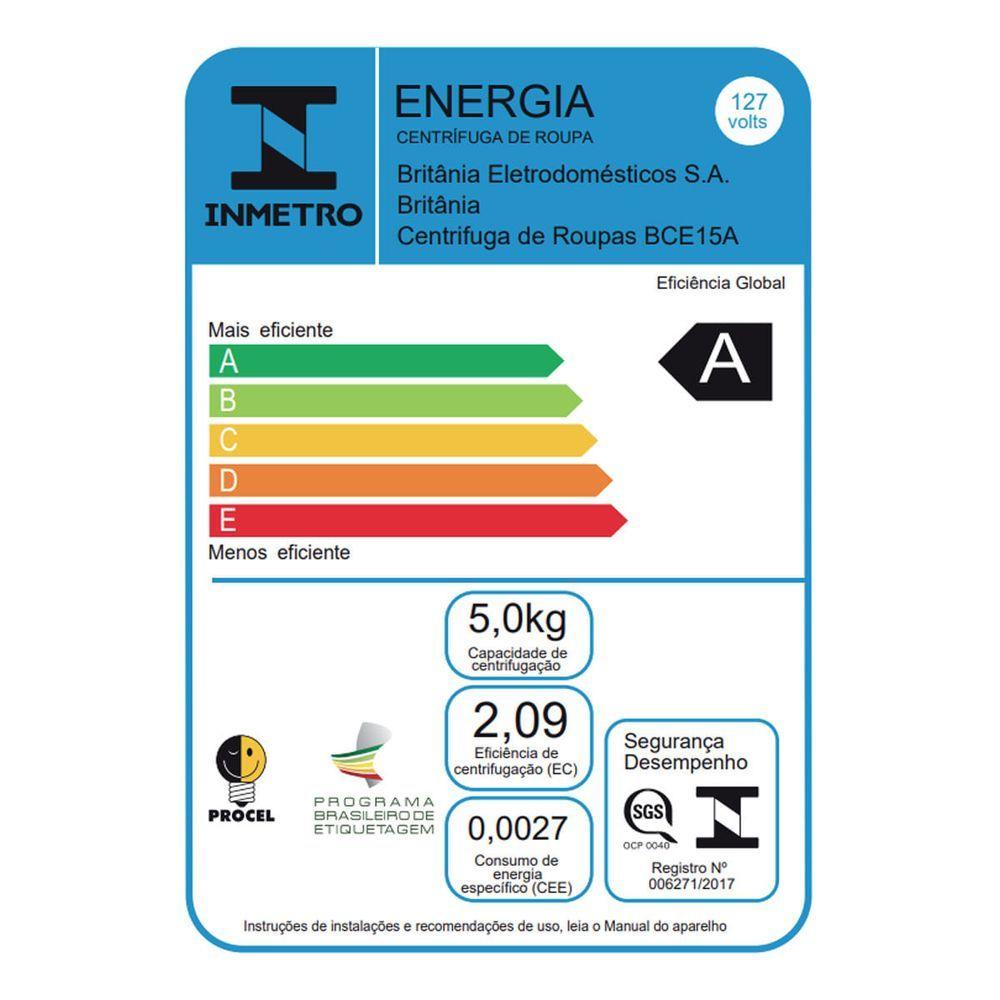 Centrifuga De Roupas 15kg Britânia Timer Programável Bce15a 127vA Centrifuga de Roupas 15Kg Britânia Timer programável BCE15A é a solução prática e eficiente para agilizar o processo de secagem das roupas. Com cesto extragrande, suporta até 15Kg de roupas molhadas e 5Kg de roupas secas, garantindo alto desempenho em cada uso.A Centrífuga Britânia conta com saída de água por mangueira, que permite drenar facilmente a água, possibilitando até o reaproveitamento em outras tarefas domésticas. O timer de 5 minutos com desligamento automático assegura praticidade e segurança, oferecendo maior comodidade ao usuário.Pensando no cuidado das peças, a Centrífuga BCE15A traz dupla grade de proteção – interna e intermediária – para centrifugar roupas pequenas e delicadas sem risco de danos. Além disso, o sistema de segurança interrompe a centrifugação sempre que a tampa é aberta.Compacta, leve e resistente, a Centrifuga de Roupas 15Kg Britânia Timer programável BCE15A alia desempenho, economia e durabilidade, sendo ideal para quem busca eficiência na lavanderia com mais praticidade no dia a dia.- Capacidade de 15Kg para roupas molhadas e 5Kg para roupas secas- Saída de água por mangueira- Timer programável com desligamento automático- Sistema de segurança- Dupla grade de proteção- Porta-fio integrado- Cesto plástico.Garantia (Dias) - 360Modelo - BCE15AEstado - Novoofficialstoreid_meli - 5551OBSERVACAO - Somente faturamos para o nosso consumidor final, ou seja, não faturamos pedidos para CNPJ por este portal de vendas;Marca - Britâniameli_shipping_mode - me1Certificação de teste externa - Não aplicávelNome do tema de variação - VoltagemManual de Instruções - https://britaniaeletro-my.sharepoint.com/:b:/g/personal/marketing_britaniaeletro_onmicrosoft_com/EaQx8_fXD4lFuhMHyX9iG30BASZXPUKGAOM1uqm7cf_1eg?e=JYhBCn