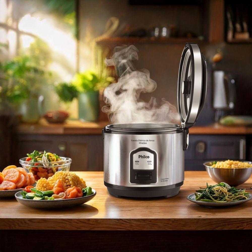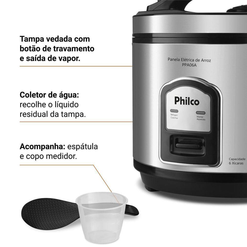 Panela de Arroz Elétrica Philco 6 Xícaras Inox 400W PPA06A 110VPrepare deliciosos pratos com a Panela de Arroz Elétrica Philco 6 Xícaras Inox Visor Glass 400W PPA06A, a solução ideal para quem busca praticidade e eficiência na cozinha. Com capacidade para 6 xícaras, ela atende perfeitamente às necessidades de famílias e pessoas com rotina agitada, oferecendo porções ideais para o dia a dia.Sua potência de 400W garante um cozimento rápido e uniforme, deixando o arroz soltinho e saboroso sem esforço. O acabamento em inox da Panela de Arroz Philco traz elegância e durabilidade, enquanto a tigela com revestimento antiaderente facilita a limpeza, evitando que o arroz grude e garantindo refeições sem complicação.A tampa com Visor Glass permite acompanhar o preparo sem precisar abrir, preservando o vapor e o sabor dos alimentos. Além disso, a Panela de Arroz PPA06A possui vedação segura com botão de travamento e saída de vapor, garantindo mais segurança no uso. O cordão elétrico removível possibilita levar a panela diretamente à mesa, adicionando praticidade e conveniência à sua rotina.Invista na Panela de Arroz Elétrica Philco PPA06A e traga mais conforto, sabor e organização para sua cozinha. Uma aliada perfeita para preparar arroz, legumes e muito mais com agilidade e estilo.Capacidade da tigela em xicaras: 6 xícaras de arroz cruCapacidade de 2LPotência: 400WRevestimento Antiaderente da tigelaTampa com Visor GlassFunções: Cozinhar, refogar, manter aquecidoTigela removívelAlças somente na tampaCordão removívelLuz indicadora Desligamento automáticoA tigela pode ser levada à lava-louçasColetor de água removível para limpezaBandeja para cozimento de legumes no vapor.Especificações Técnicas:Marca: PhilcoTampa: Com visorModelo: PPA06AEstado: NovoToque frio: SimTipo: Panela de arrozCapacidade: 6 xícarasDesligamento automático: SimBandeja perfurada: SimDisplay: MecânicoCor: Inox PretoCopo dosador: SimEspátula: SimPotência (W): 400WRevestimento: AntiaderenteSistema de cozedura: A vaporCom revestimento antiaderente: SimMateriais: TeflonAltura do produto: 24,3 cmLargura do produto: 23 cmComprimento do produto: 22 cmPeso do produto: 1,74 kgAltura com embalagem: 25,2 cmLargura com embalagem: 23,6 cmComprimento com embalagem: 23,6 cmPeso com embalagem: 2,03 kgGarantia (Dias): 360Observação: Somente faturamos para o nosso consumidor final, ou seja, não faturamos pedidos para CNPJ por este portal de vendas;