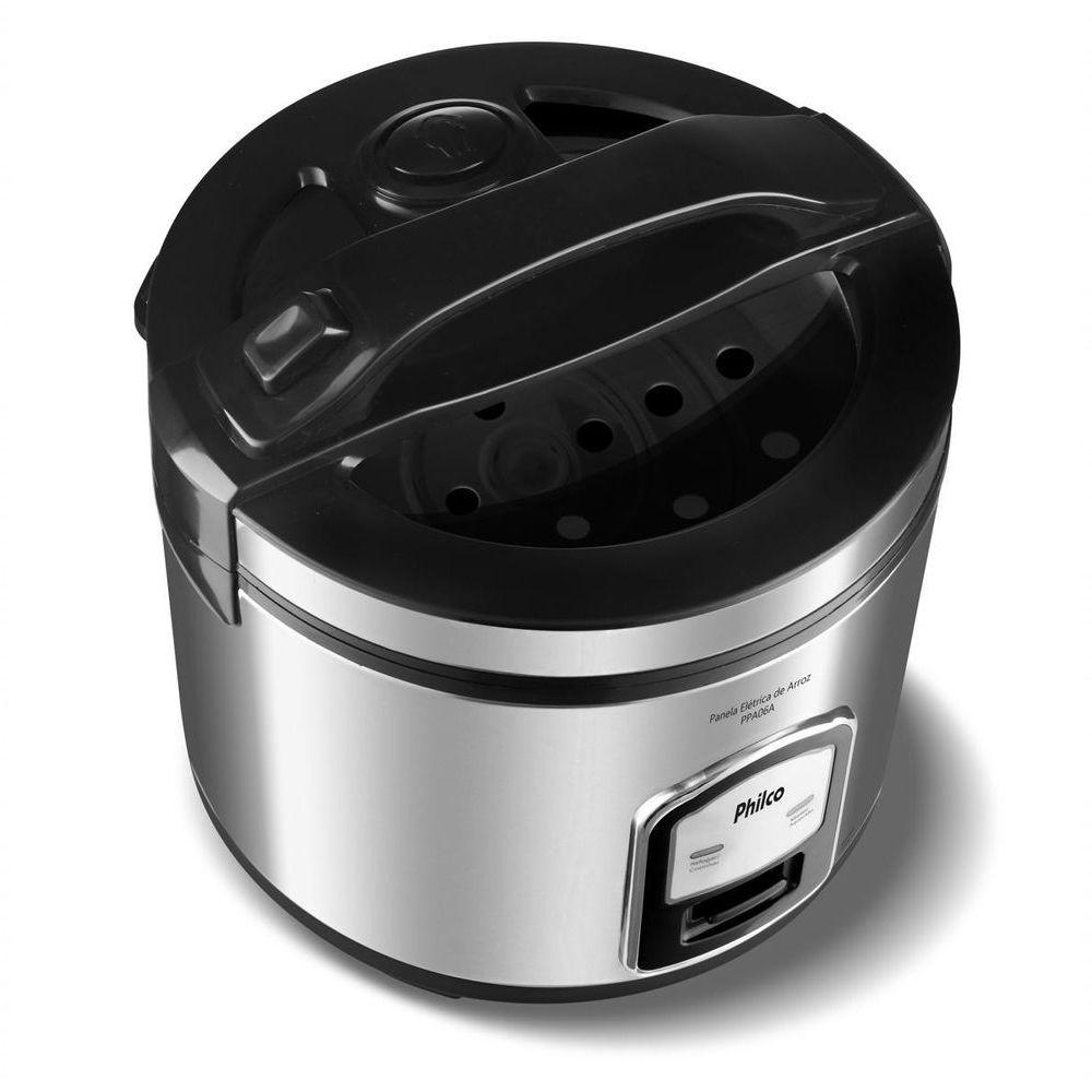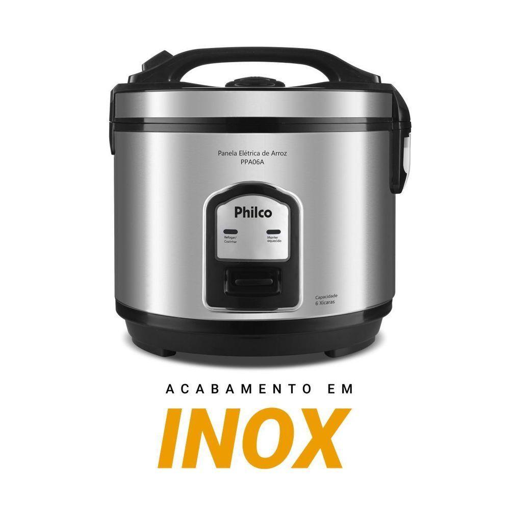 Panela de Arroz Elétrica Philco 6 Xícaras Inox 400W PPA06A 220VPrepare deliciosos pratos com a Panela de Arroz Elétrica Philco 6 Xícaras Inox Visor Glass 400W PPA06A, a solução ideal para quem busca praticidade e eficiência na cozinha. Com capacidade para 6 xícaras, ela atende perfeitamente às necessidades de famílias e pessoas com rotina agitada, oferecendo porções ideais para o dia a dia.Sua potência de 400W garante um cozimento rápido e uniforme, deixando o arroz soltinho e saboroso sem esforço. O acabamento em inox da Panela de Arroz Philco traz elegância e durabilidade, enquanto a tigela com revestimento antiaderente facilita a limpeza, evitando que o arroz grude e garantindo refeições sem complicação.A tampa com Visor Glass permite acompanhar o preparo sem precisar abrir, preservando o vapor e o sabor dos alimentos. Além disso, a Panela de Arroz PPA06A possui vedação segura com botão de travamento e saída de vapor, garantindo mais segurança no uso. O cordão elétrico removível possibilita levar a panela diretamente à mesa, adicionando praticidade e conveniência à sua rotina.Invista na Panela de Arroz Elétrica Philco PPA06A e traga mais conforto, sabor e organização para sua cozinha. Uma aliada perfeita para preparar arroz, legumes e muito mais com agilidade e estilo.Capacidade da tigela em xicaras: 6 xícaras de arroz cruCapacidade de 2LPotência: 400WRevestimento Antiaderente da tigelaTampa com Visor GlassFunções: Cozinhar, refogar, manter aquecidoTigela removívelAlças somente na tampaCordão removívelLuz indicadora Desligamento automáticoA tigela pode ser levada à lava-louçasColetor de água removível para limpezaBandeja para cozimento de legumes no vapor.Especificações Técnicas:Marca: PhilcoTampa: Com visorModelo: PPA06AEstado: NovoToque frio: SimTipo: Panela de arrozCapacidade: 6 xícarasDesligamento automático: SimBandeja perfurada: SimDisplay: MecânicoCor: Inox PretoCopo dosador: SimEspátula: SimPotência (W): 400WRevestimento: AntiaderenteSistema de cozedura: A vaporCom revestimento antiaderente: SimMateriais: TeflonAltura do produto: 24,3 cmLargura do produto: 23 cmComprimento do produto: 22 cmPeso do produto: 1,74 kgAltura com embalagem: 25,2 cmLargura com embalagem: 23,6 cmComprimento com embalagem: 23,6 cmPeso com embalagem: 2,03 kgGarantia (Dias): 360Observação: Somente faturamos para o nosso consumidor final, ou seja, não faturamos pedidos para CNPJ por este portal de vendas;