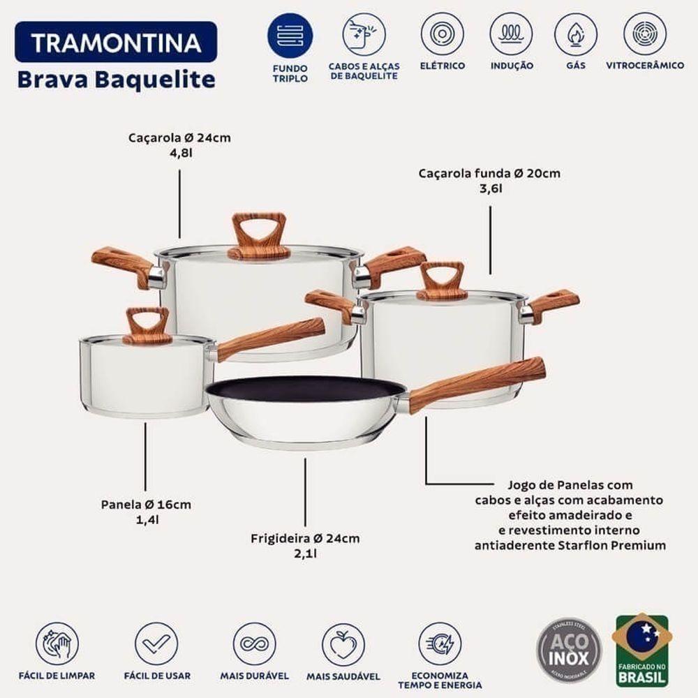 Jogo De Panelas Tramontina Brava Antiaderente Aço Inox Com Efeito Amadeirado 4 PeçasTransforme sua experiência na cozinha com o Jogo de Panelas Tramontina Brava Antiaderente em Aço Inox, completo com 4 peças. Feitas em aço inox com fundo triplo e revestimento interno antiaderente Starflon Premium, essas panelas distribuem o calor de maneira uniforme, garantindo um cozimento mais rápido e eficiente. Além disso, são extremamente resistentes, duráveis e fáceis de limpar. Este conjunto é ideal para quem aprecia estar na cozinha, oferecendo qualidade e design incomparáveis, características que só a Tramontina pode proporcionar.Recomendações de Uso:Modo de Uso: A capacidade volumétrica máxima para cozimento é de 3/4 da capacidade total da peça. Antes de usar esta panela pela primeira vez, remova eventuais etiquetas e lave-a. Em seguida, unte a superfície com óleo e aqueça a panela, em fogo baixo, por 2 a 3 minutos, dependendo do tamanho da panela. Espere esfriar e lave-a com esponja e detergente neutro em água morna. Após, enxágue-a. Quando cozinhar alimentos, sempre use fogo baixo ou médio. Isso ajuda a preservar seus nutrientes. E também ajuda a preservar a superfície do revestimento. Quando a panela for utilizada no fogão a gás, a chama não deve ultrapassar a base da panela. No caso de chama elétrica, ele deverá ter diâmetro igual ou inferior ao da panela. Para preservar a superfície, não utilize utensílios com pontas metálicas. Para isso, recomendamos utilizar apenas utensílios de nylon, silicone ou madeira. Não aqueça o alimento colocando uma panela do mesmo diâmetro sobre outra. Esse procedimento é perigoso, pois cria vácuo e impossibilita sua retirada. Não deixe a panela vazia sobre uma fonte de calor. Deixe a panela quente somente em superfícies resistentes ao calor. Sempre deixe a panela esfriar antes de mergulhá-la na água. Se deixar queimar os alimentos, deixe a panela de molho em água durante algum tempo antes de lavá-la. O revestimento antiaderente é perfeitamente para uso na máquina de lavar, mas sua lavagem manual poderá ser feita de forma fácil devido ao revestimento. Repita o processo de primeiro uso sempre que for feita a lavagem na máquina de lavar louça. Recomenda-se repetir o processo periodicamente para melhor conservação do revestimento. Utilize somente detergente neutro e esponja macia para a limpeza. Depois da lavagem, sempre que possível, enxágue a panela com água quente e seque-a imediatamente para que mantenha o brilho . O cloro da água e o detergente podem deixar manchas na panela.- Foto meramente ilustrativa.Informações Adicionais:- Tampa com saída de vapor;- Pode ser lavado na lava-louças diariamente;- Totalmente feita de aço inox, com revestimento interno de antiaderente Starflon Premium;- Componentes: cabos, alças e pegadores em baquelite com acabamento soft touch aveludado com efeito amadeirado proporcionando um manejo mais suave;- Fácil de limpar: deixar sua panela brilhando é simples, você só precisa de água, sabão e uma esponja macia. Se preferir, é só colocar na máquina de lavar;- Fundo triplo (aço inox + alumínio + aço inox), que distribui o calor uniformemente, proporcionando um cozimento mais rápido. Por isso, você pode manter o fogo baixo durante todo o preparo e, assim, poupar energia.
