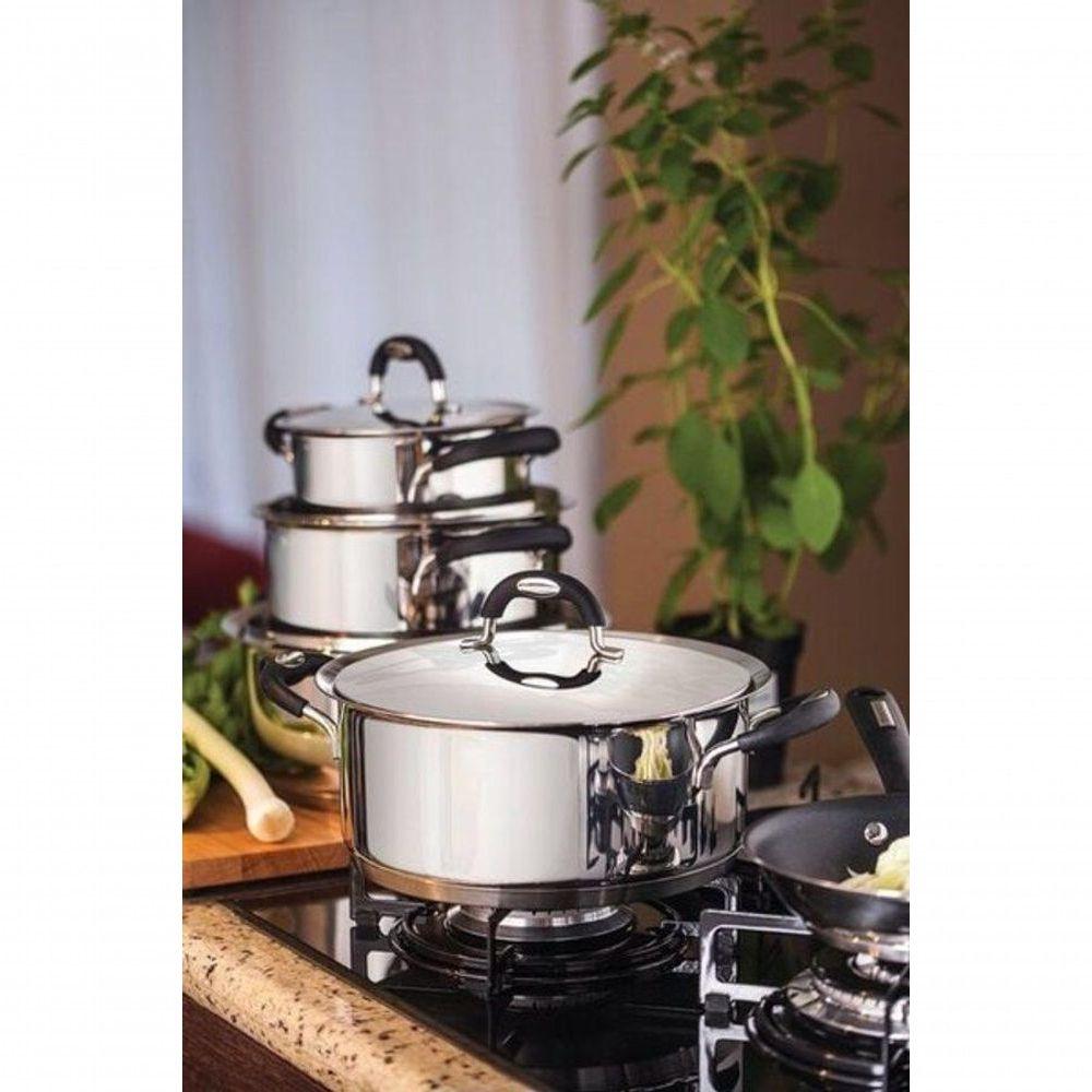 Caçarola Rasa Tramontina Duo Silicone 24cm Em Aço InoxA Tramontina usa a mais alta tecnologia para produzir panelas de aço inox com fundo triplo. São duas camadas de aço inox envolvendo uma camada de alumínio. Dessa forma, o calor da chama se distribui por igual, deixando os alimentos muito mais macios e saborosos. Além disso a comida cozinha muito mais rápido, o que acaba gerando economia.Recomendações de Uso:Antes do uso: Antes de utilizar o , remova as eventuais etiquetas e lave-o com água quente e de uso: Use uma fonte de calor brando para evitar que o alimento grude no fundo da caçarola. O fundo triplo distribui uniformemente o calor, não sendo necessário o fogo alto. E, além disso, você economiza energia. Quando a caçarola for utilizada no fogão a gás, a chama não deve ultrapassar a base da caçarola. No caso de uso de chapa elétrica, a chapa deverá ter diâmetro igual ou inferior ao da caçarola. Sempre dissolva o sal em água fervendo ou com os alimentos, mexendo os ingredientes no início do cozimento. Não aqueça o alimento colocando uma caçarola do mesmo diâmetro sobre a outra. Esse procedimento é perigoso, pois cria vácuo e impossibilita a retirada do mesmo. Alguns alimentos que possuem amido, como massa e arroz, poderão deixar manchas na parte interna da caçarola durante o ós o uso: Para remover facilmente as manchas, passe um pano umedecido com suco de limão ou vinagre, Evite deixar alimento na caçarola por muito tempo o sal também pode provocar manchas. Para que a caçarola de aço inox fique sempre bonita e com brilho, recomendamos que seja lavada somente com detergente e esponja. A Tramontina desenvolveu uma pasta especial para polir e remover manchas nos produtos de aço inoxidável, que está disponível nos principais pontos de venda. (94537000)Depois da lavagem, sempre que possível, enxágue a caçarola com água quente e seque-a imediatamente, para que ela mantenha o brilho , pois o cloro e as substâncias contidas na água podem deixar manchas na caçarola. Não deixe a caçarola vazia sobre uma fonte de calor. Deixe as caçarolas quentes somente em superfícies resistentes ao calor. Os cabos de inox aquecem durante o cozimento, por isso use luvas durante o manuseio.- Foto meramente ilustrativa- Embalagem litografadaInformações Adicionais:- Totalmente feita em aço inox, por isso não solta nenhum resíduo nos alimentos, mantendo-os saudáveis. - Altamente durável, mantém as características , preservando a beleza, a higiene e a durabilidade do material. - O fundo triplo (aço inox + alumínio + aço inox) distribui o calor uniformemente, proporcionando um cozimento mais rápido e uniforme, economizando energia e deixando os alimentos aquecidos por mais tempo. - Desenho limpo e sem cantos torna a limpeza mais fácil.- As alças, cabos e pegadores da linha vêm com revestimento em silicone antitérmico que evita queimaduras e torna a pega mais macia e confortável. - Tampa com escape na lateral para saída do vapor, evitando assim o efeito do vácuo, e com encaixe perfeito.- Com acabamento em alto brilho. - Pode ser lavada diariamente na máquina de lavar louças.- Pode ser utilizada nos fogões: elétrico, gás, indução e vitrocerâmico.