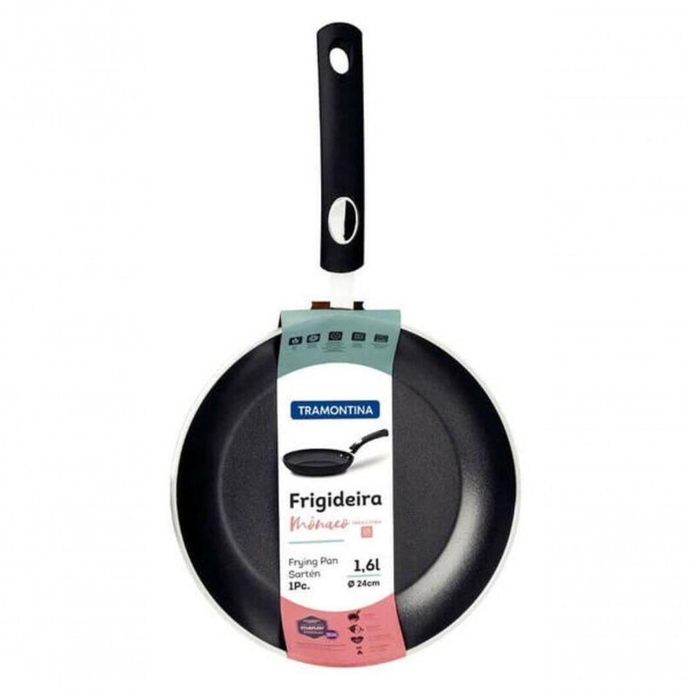 Frigideira Tramontina Mônaco Induction Com Revestimento Interno E Externo Antiaderente Starflon Premium Preto 24cmA Frigideira Tramontina Mônaco Induction em Alumínio com Revestimento Interno e Externo Antiaderente Starflon Premium Preto 24 cm de diâmetro 1,6 L é perfeita para quem preza por alta qualidade na cozinha! Devido ao corpo de alumínio com espessura de 3,0 mm e ao revestimento interno e externo de antiaderente Starflon Premium, ela proporciona o cozimento rápido e uniforme dos alimentos, garante que eles não grudem em sua superfície e ainda se torna durável e não prejudicial a saúde. Seu cabo metálico possui proteção de silicone e proporciona redução da propagação de calor, aumentando a e otimizando o seu manuseio. Ela ainda é muito fácil de limpar e pode ir à máquina de lavar louças, facilitando seu dia a dia. Com a Tramontina, você tem os melhores itens para equipar sua cozinha!Recomendações de Uso:A capacidade volumétrica máxima para cozimento é de 3/4 da capacidade total da peça. Posicione os cabos dos utensílios voltados ao centro do fogã fogões com grade, centralize a peça e alinhe o cabo com a grade. Utensílios quentes devem estar fora do alcance das crianç produto não pode sofrer modificações. Antes do primeiro uso, lave com esponja macia, sabão neutro ou detergente líquido. Depois de secar, unte a área interna com óleo ou gordura e leve ao fogo por um ou dois minutos. Deixe esfriar e lave novamente. Seu utensílio Starflon está pronto para uso com ou sem gordura, sempre em fogo baixo ou médio (nunca superior a 350ºC). Para mexer os alimentos use somente utensílios de silicone, nylon ou madeira. Evite a imersão do utensílio quente em água fria. Nunca utilize produtos abrasivos na lavagem. Se deixar queimar alimentos, umedeça a área e reserve até que possa remover os resíduos grudados com esponja e sabã descarte dos produtos e embalagens siga as orientações de reciclagem vigentes. Este produto não necessita de manutenção, apenas limpeza.Informações Adicionais:Corpo de alumínio com espessura de 3,0 mm que proporciona cozimento rápido e uniforme. Revestimento interno e externo de antiaderente Starflon Premium que não gruda, é fácil de limpar, mais durável e não é prejudicial a saú metálico com proteção de silicone que proporciona redução da propagação de calor, aumentando a e melhorando a empunhadura. Pode ir à máquina de lavar louças facilitando seu dia a dia.