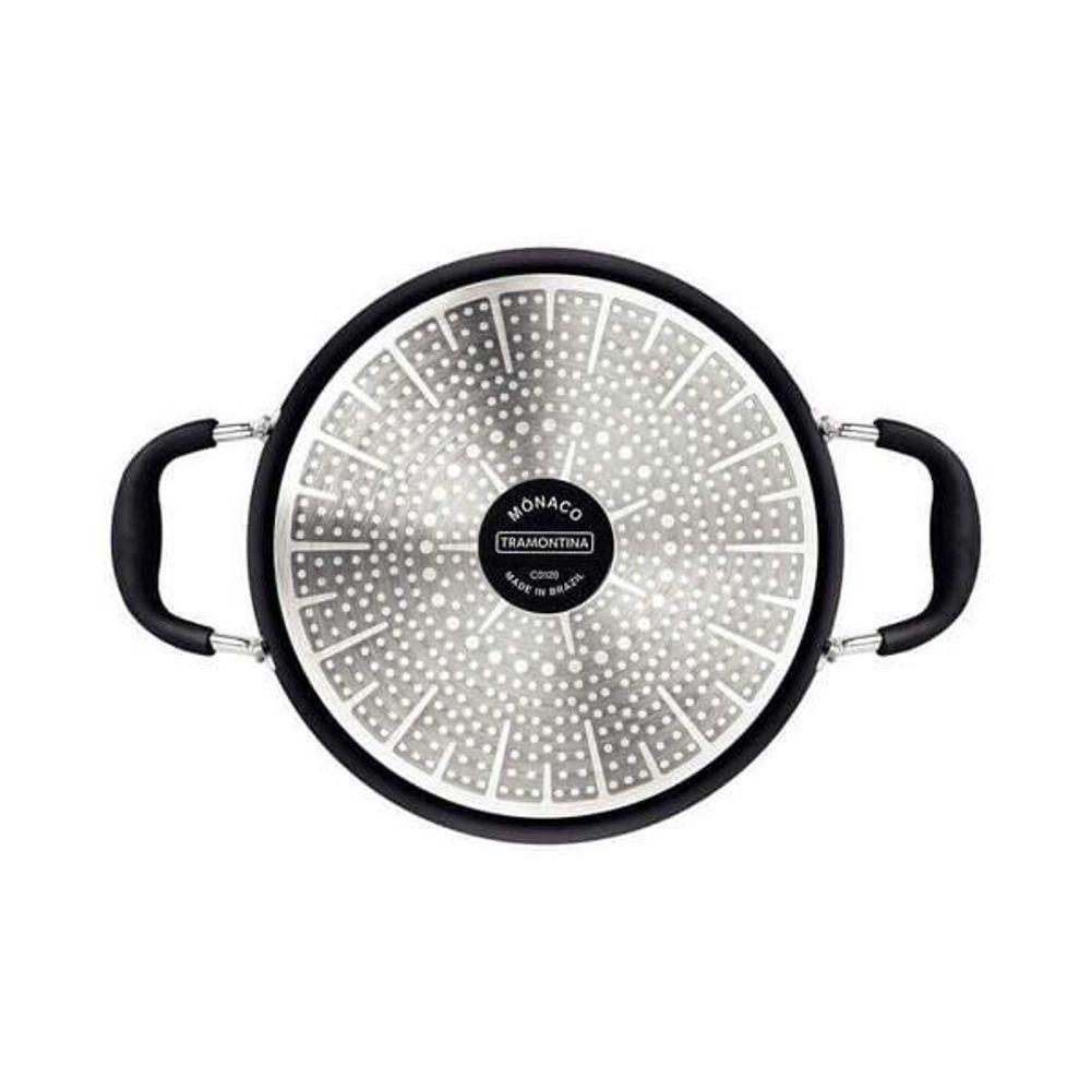 Caçarola Tramontina Mônaco Induction Com Revestimento Antiaderente Starflon Premium Preto Com Tampa 28cmPreparar aquele risoto delicioso ficou muito melhor com a Caçarola Tramontina Mônaco Induction em Alumínio com Revestimento Interno e Externo Antiaderente Starflon Premium Preto com Tampa de Vidro 28 cm 6,4 L! Ela é produzida em alumínio com espessura especial e revestimento interno de antiaderente Starflon Premium, características que proporcionam um cozimento de forma rápida e eficaz e evita que os alimentos grudem; Seu cabo metálico com proteção de silicone reduz a propagação de calor, aumentando a e deixando seu manuseio muito mais confortável. Ela ainda é fácil de limpar e pode ser lavada na máquina de lavar louças, facilitando seu dia a dia. Um item durável, não prejudicial a saúde e que acompanha tampa de vidro temperado com bordas em aço inox que auxilia e facilita o preparo dos alimentos!Recomendações de Uso:A capacidade volumétrica máxima para cozimento é de 3/4 da capacidade total da peça. Posicione os cabos dos utensílios voltados ao centro do fogã fogões com grade, centralize a peça e alinhe o cabo com a grade. Utensílios quentes devem estar fora do alcance das crianç produto não pode sofrer modificações. Antes do primeiro uso, lave com esponja macia, sabão neutro ou detergente líquido. Depois de secar, unte a área interna com óleo ou gordura e leve ao fogo por um ou dois minutos. Deixe esfriar e lave novamente. Seu utensílio Starflon está pronto para uso com ou sem gordura, sempre em fogo baixo ou médio (nunca superior a 350ºC). Para mexer os alimentos use somente utensílios de silicone, nylon ou madeira. Evite a imersão do utensílio quente em água fria. Nunca utilize produtos abrasivos na lavagem. Se deixar queimar alimentos, umedeça a área e reserve até que possa remover os resíduos grudados com esponja e sabã descarte dos produtos e embalagens siga as orientações de reciclagem produto não necessita de manutenção, apenas limpeza.Informações Adicionais:Corpo de alumínio com espessura de 3,0 mm que proporciona cozimento rápido e uniforme. Revestimento interno e externo de antiaderente Starflon Premium que não gruda, é fácil de limpar, mais durável e não é prejudicial a saú de vidro temperado com borda de aço inox e saída de vapor. Alças e pegadores metálicos com proteção de silicone que proporciona redução da propagação de calor, aumentando a e melhorando a empunhadura. Pode ir à máquina de lavar louças facilitando seu dia a dia.