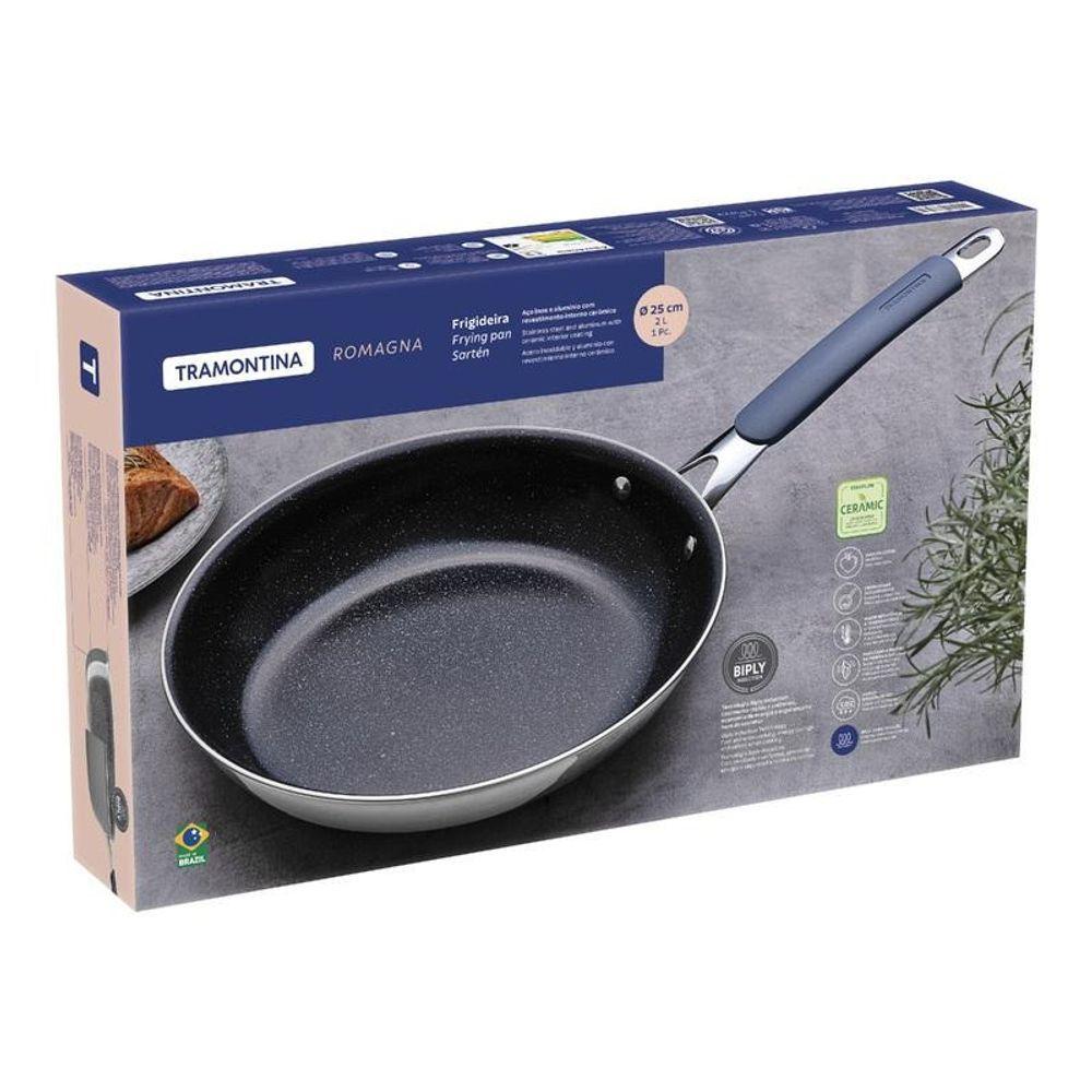 Frigideira Tramontina Romagna Aço Inox E Alumínio 25cm Com Revestimento Cerâmico Black StoneEleve sua experiência culinária com a Frigideira Tramontina Romagna de 25 cm, a escolha perfeita para quem valoriza qualidade e durabilidade na cozinha. Parte da renomada linha Romagna, esta frigideira combina uma camada dupla de alumínio e aço inoxidável, proporcionando um cozimento uniforme e eficiente. O revestimento interno cerâmico garante que suas receitas sejam preparadas de forma saudável e uniforme, enquanto o acabamento externo em inox polido black stone adiciona um toque de elegância e modernidade à sua cozinha. Além de seu design sofisticado, a frigideira é resistente e fácil de limpar, tornando o seu dia a dia na cozinha mais prático. com todos os tipos de fogões, incluindo indução, a Frigideira Romagna oferece versatilidade para preparar qualquer refeição com perfeição. Seu cabo em aço carbono cromado com luva de silicone assegura e conforto durante o manuseio, prevenindo queimaduras e proporcionando uma experiência culinária mais agradável. Invista na qualidade e tradição da marca Tramontina e descubra o prazer de cozinhar com excelência. Adquira agora a Frigideira Tramontina Romagna e transforme suas refeições com um toque e sofisticado!Recomendações de Uso:Modo de Uso: O uso prolongado em temperaturas altas pode causar o amarelamento da superfície em aço inox. Para que a panela de aço inox fique sempre bonita e com brilho, recomendamos que seja lavada somente com detergente neutro e esponja. Nas partes foscas da panela pode-se utilizar o lado mais abrasivo da esponja com saponáceo líquido, para remover as manchas mais difíceis, ou ainda, pode ser usada a pasta para polimento e remoção de manchas da Tramontina. Depois da lavagem, enxágue a panela com água quente e seque-a imediatamente, para que ela mantenha o brilho , pois o cloro e as substâncias contidas na água podem deixar manchas na panela.- Foto meramente ilustrativa.Informações Adicionais:Corpo de aço inox + alumínio;Revestimento interno cerâmico e acabamento externo polido;Tecnologia Biply, dupla camada metálica: aço inox + alumínio;Com espessura de 2,7mm de alumínio e 0,6mm de aço inox;Seu utensílio resiste à máquina de lavar louças, embora diferentes detergentes para uso nestas máquinas podem ser mais agressivos e acelerar o desgaste de seu utensílio e reduzir as propriedades de antiaderência.
