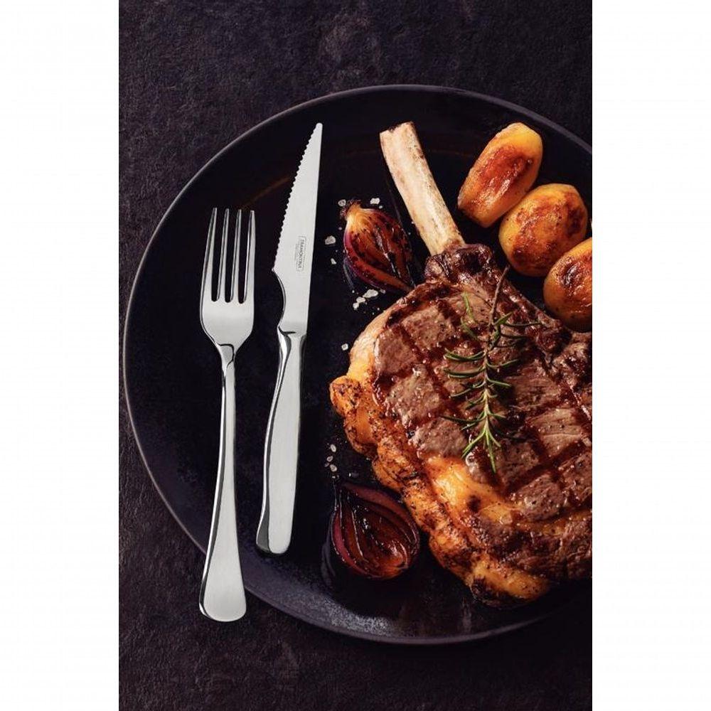 Jogo Para Churrasco Tramontina Zurique Aço Inox Facas Fio Serrilhado 12 PeçasPara quem valoriza cada detalhe do churrasco, o Jogo para Churrasco Tramontina Zurique em Aço Inox com 12 peças é a escolha certa. Com facas de fio serrilhado e lâminas temperadas, garante cortes mais precisos e resistência à corrosão, sem agredir superfícies como porcelanas. Os garfos têm dentes polidos e bordas arredondadas, proporcionando mais conforto ao servir e comer. As peças são inteiramente fabricadas em aço inox e mantêm o acabamento em alto brilho por muito mais tempo. O cabo ergonômico se encaixa bem na mão e oferece equilíbrio entre lâmina e empunhadura. Ideal para compor a mesa com bom gosto, qualidade e funcionalidade, seja no dia a dia ou em ocasiões especiais. Um jogo de talheres para churrasco feito para quem busca desempenho e presença à mesa.Recomendações de Uso:Modo de Uso: ;Use apenas sabão ou detergente e uma esponja macia. Outros tipos de produtos, como palha de aço, poderão riscar ou prejudicar o brilho dos talheres. Enxágue bem cada peça a fim de remover totalmente os resíduos dos produtos de limpeza, que, por serem abrasivos, podem atacar o inox. Sempre que possível, use água quente, pois renova o brilho do talher. Após a lavagem, enxugue imediatamente os talheres, caso contrário, as substâncias químicas da água (cloro) poderão causar manchas. Evite atrito entre os talheres durante o processo de lavagem e no armazenamento, para mantê-los sem riscos. Evite o contato das peças com superfícies quentes. Elas provocam a descoloração do produto. Não guarde os talheres em locais úmidos. A umidade também provoca manchas. Qualquer faca, independentemente de marca, para manter o fio de corte, é fabricada em aço com maior teor de carbono e, por isso, é menos resistente à corrosão. Assim, pedimos uma atenção especial para este artigo, pois estará mais propenso aos problemas citados. Usando máquina de lavar louças: Não carregue em demasia a cesta dos talheres. Separe bem as peças, pois o contato permanente entre as mesmas, durante a secagem, poderá causar manchas. Retire os talheres logo que tenha terminado o ciclo "enxaguar", a fim de que os mesmos sejam secados manualmente.- Foto meramente ilustrativa.Informações Adicionais: - Não riscam as porcelanas;- Acabamento em alto brilho;- Podem ser lavadas diariamente na máquina de lavar louças;- Garfos com dentes polidos na parte interna, com formato apropriado para a boca;- Facas com lâminas temperadas e fios serrilhados, que garantem maior durabilidade no fio de corte e maior resistência à corrosão.
