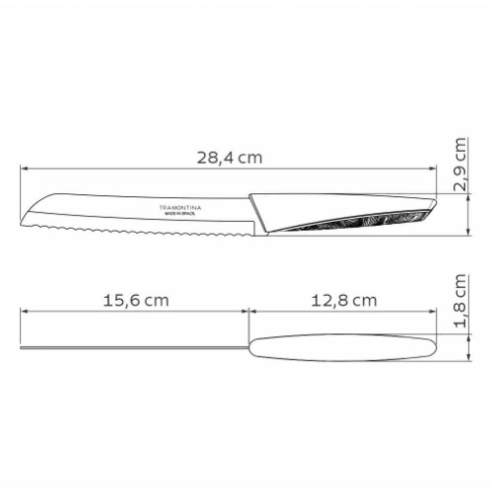 Faca Para Pão Tramontina Lyf 7 Verde NaturezaInspirada em elementos naturais, como o vento e a folha, a faca para pão Tramontina LYF com lâmina em aço inox e cabo de polipropileno PCR verde natureza 7 polegadas tem formas fluidas e é a escolha ideal para quem deseja deixar sua cozinha completa. Com lâmina em aço inox e cabo em polipropileno PCR, ela é uma faca que corta sem amassar, pois tem fio serrilhado. Resistente e durável, ela ainda pode ser levada à máquina de lavar louças, otimizando suas tarefas na cozinha. A faca para pão Tramontina LYF é produzida com materiais reciclados e recicláveis e é a escolha mais sustentável para sua cozinha!Recomendações de Uso:Antes do Uso: Lave bem a peça e seque-a. Tenha cuidado ao manusear produtos cortantes e perfurantes e mantenha-os fora do alcance das crianças.Modo de Uso: Para maior durabilidade do produto recomenda-se secar bem antes de guardar, mesmo após lavagem em máquina. Recomenda-se o uso de tábuas de polipropileno ou madeira da Tramontina para maior durabilidade do fio da faca. Não é indicado o uso da faca para o corte de alimentos congelados. Para descarte dos produtos e embalagem siga as orientações de reciclagem vigentes.- Foto meramente ilustrativa.Informações Adicionais:- Cabo de polipropileno PCR;- O aço inox é 100% reciclável- A lâmina serrilhada corta sem amassar;- Pode ir à máquina de lavar louças facilitando seu dia a dia; ;