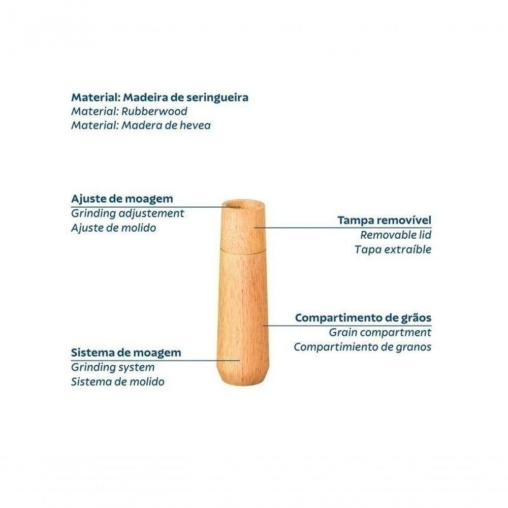 Moedor Tramontina De Sal E Pimenta Realce 19,7cm Em Madeira Seringueira Com 19,7 cm de altura, o moedor de sal e pimenta Tramontina Realce em madeira de seringueira é uma escolha versátil para quem valoriza sabor na medida certa. Sua capacidade generosa – 60 g de sal grosso ou 25 g de pimenta, é perfeita para quem gosta de temperar direto na panela ou à mesa. O ajuste de moagem permite personalizar a textura dos grãos, enquanto as engrenagens resistentes garantem um desempenho contínuo. O acabamento em madeira leva charme e um toque natural para diferentes estilos de cozinha, do clássico ao contemporâneo.Recomendações de Uso:Modo de Uso: ;Uso seguro e adequado: Tenha cuidado ao manusear o produto, poderá quebrar ao sofrer quedas ou impactos. Ao usar o moedor com sal em ambientes muito úmidos, ele poderá não funcionar adequadamente; recomendamos trocar ou secar o sal. Não lavar o moedor; para limpeza, use um pano úmido na parte externa. Para descarte dos produtos e embalagens, siga as orientações de reciclagem vigentes. Tampa removível Compartimento de grãos Sistema de moagem Ajuste de moagem Para regular o tamanho do grão: Com uma das mãos segure o compartimento de grãos e com a outra gire/desrosqueie o suporte de regulagem. Para uma moagem fina, gire o suporte de regulagem no sentido horário. Para uma moagem mais grossa, gire o suporte de regulagem no sentido anti-horário. Para abastecer: Retire a tampa do compartimento de grãos, removendo totalmente o suporte de regulagem, girando-o no sentido anti-horário, e puxe a tampa. Após isso, adicione o grão a ser moído. Para moer: Com o moedor na posição correta, segure o compartimento de grãos com uma das mãos e com a outra gire a tampa no sentido horário, para moer o tempero. Atenção: Certifique-se de girar a tampa no sentido horário ao moer, para evitar possíveis danos. Se o moedor ficar preso durante o uso, agite suavemente o moinho de sal/pimenta, pois às vezes algum grão pode entupir o moedor, se você forçar o uso, talvez possa quebrar o moedor. Se o problema persistir, vire o moedor ao contrário, girando-o duas ou três vezes para que o grão preso no moedor volte para o compartimento e libere sua regulagem.- Foto meramente ilustrativa.Informações Adicionais:- Capacidade para sal de 60 gramas e pimenta de 25 gramas;- Possui engrenagem de alta resistência, proporcionando maior durabilidade;- Moedor em madeira seringueira com pino regulador de tamanho de grão, para que seja ajustado conforme seu gosto.