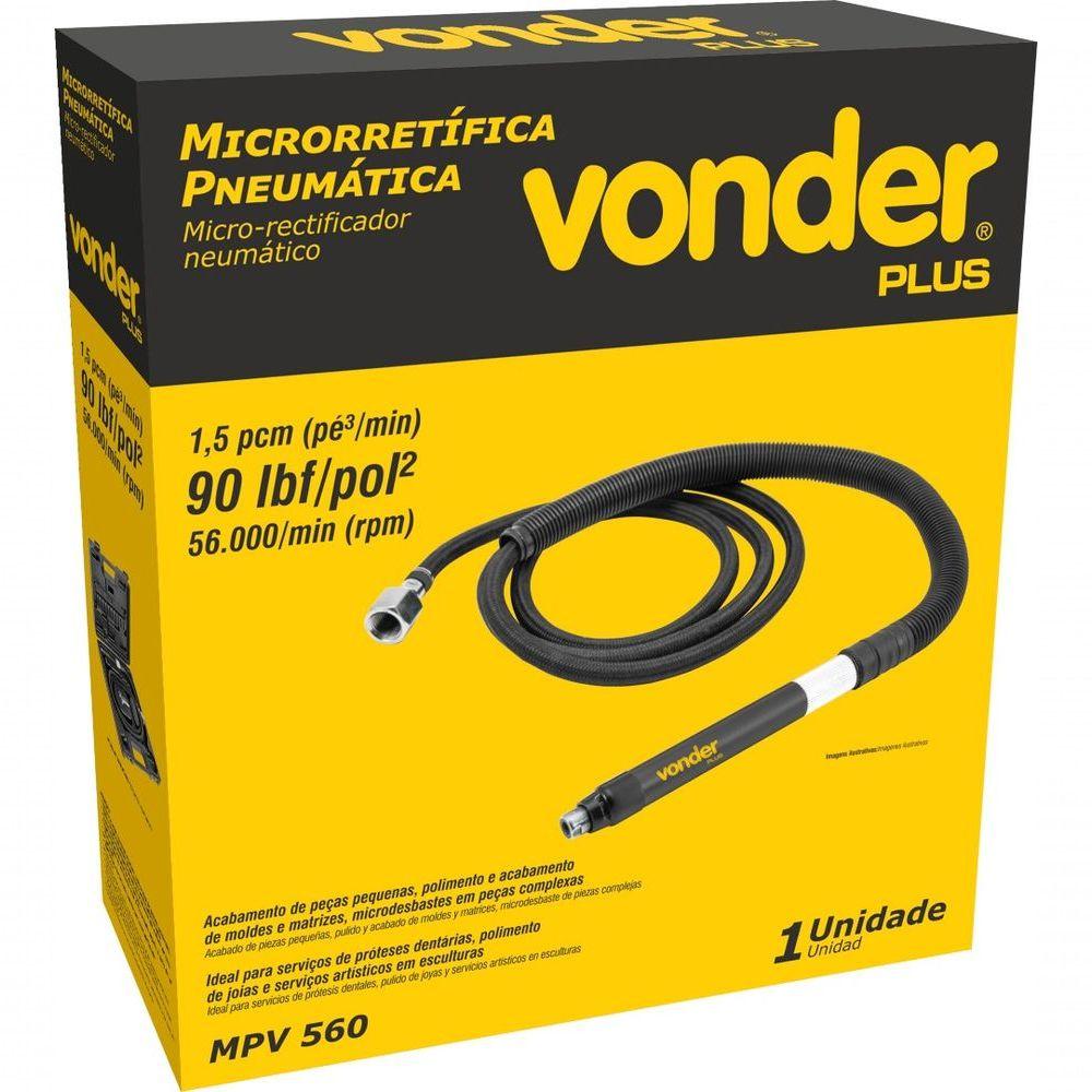 Microrretífica Pneumática Mpv 560 VonderMarca: VonderConteúdo da embalagem: 1 Microrretífica. Acompanha: mangueira com 1,45 m acoplada na máquina, 2 chaves e 2 pinças.Destaques e diferenciais:Leve e ergonômica, acompanha maleta com perfeito ajuste dos acessórios.Dicas de uso:Indicada para acabamento de peças pequenas, polimento e acabamento de moldes e matrizes, microdesbastes em peças complexas e polimento de coletores de admissão e de escape em motores de combustão interna. Ideal para serviços de próteses dentárias, polimento de joias e serviços artísticos em esculturas.Detalhes Técnicos:Consumo de ar da retifica: 1,5 pcm (pé³/min) Diâmetro da pinça: 1/8 - 3,2 mm e 3,0 mm Pressão de trabalho: 90 lbf/pol² Rosca de entrada de ar da retifica: 1/4 NPT interna (fêmea) Rotação da microrretífica (rpm): NA