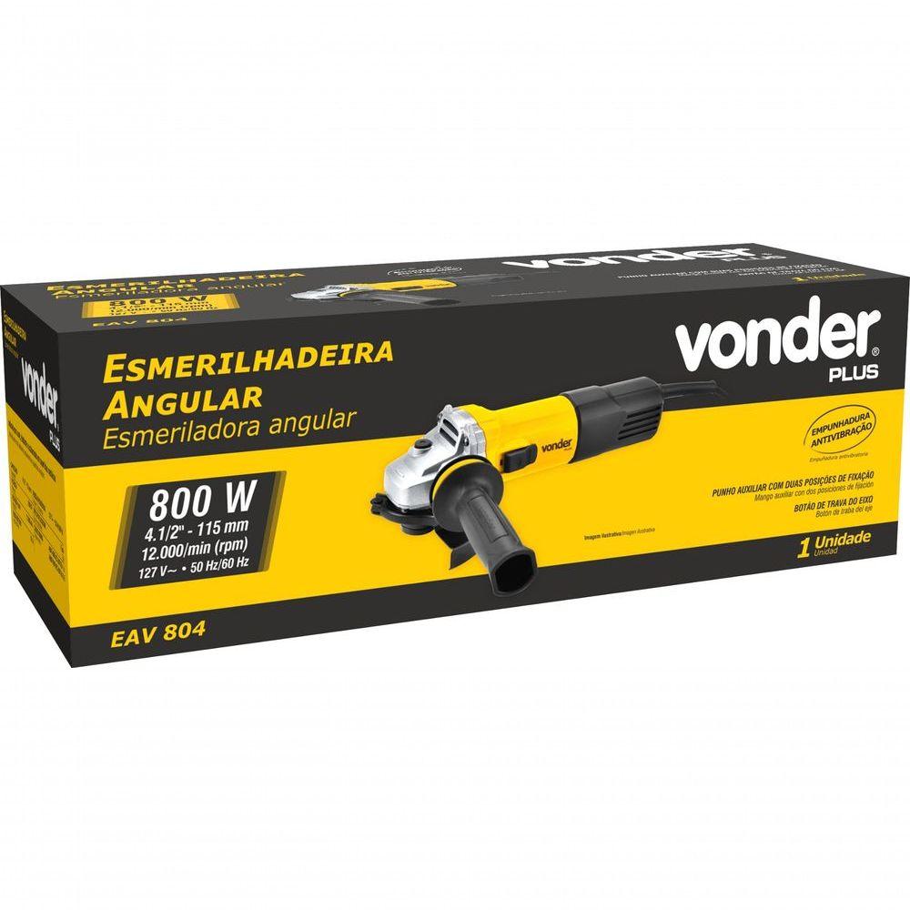 Esmerilhadeira Eav804 110V VonderMarca: VonderConteúdo da embalagem:1 Esmerilhadeira angular. Acompanha: 1 capa de proteção com trava de ajuste rápido, 1 punho auxiliar antivibratório e 1 chave 2 pinos.Destaques e diferenciais:Possui punho auxiliar com sistema antivibração, proporcionando maior conforto na operação, além de duas posições de fixação, que atuam como apoio durante o manuseio da ferramenta, adaptando-se a diferentes situações e locais de uso, muitas vezes de difícil acesso. Conta ainda com botão de trava do eixo, interruptor com trava de e empunhadura ergonômica, que confere maior conforto no manuseio, além de dupla isolação, garantindo maior ao operador.Aplicações e dicas de uso:Uso industrial. Indicada para corte, desbaste e acabamento em superfícies metálicas.Detalhes TécnicosModelo: EAV 804 Potência: 800 W Capacidade da esmerilhadeira (disco): - 115 mm Rosca do eixo: M 14 Tipo de velocidade: Fixa Rotação (rpm): Ajuste do cabo da esmerilhadeira: Fixo de posições de ajuste do punho: 2 posições Segue norma: ABNT NBR IEC 60745-1 e ABNT NBR IEC 60745-2-3 Tensão (V): 110V~ Frequência (Hz): 50 Hz/60 Hz Aceleração transmitida nas mãos - braços do operador - ah: 5,62 m/s² Incerteza da aceleração transmitida nas mãos - braços do operador - k: 1,5 m/s² Massa aproximada (peso) (kg): 2,2 kg Recomendações de (avisos/alertas): Utilizar Equipamentos de Proteção Individual, como óculos de proteção, protetor auditivo, respirador para particulados, luvas e avental de raspa. Sempre fazer uma vistoria prévia da ferramenta para detectar possíveis fios desencapados ou alguma irregularidade.Garantia - E (CDC):Garantia legal: 90 dias + Garantia contratual: 9 meses (Para locadoras, garantia única e exclusiva de 90 dias) Com arranque progressivo: | Com cabo lateral: | Cor: | É mini esmerilhadeira: | É sem fio: | Frequência: | Linha: | Marca: | Modelo: | Tipo de esmerilhadeira: | Tipo de interruptor: | Velocidade mínima de rotação: | Comprimento: | Comprimento do cabo: | Com proteção contra sobrecarga: | Inclui bateria: | Modelo detalhado: | MPN: | Acessórios incluídos: | Altura: | Diâmetro do disco: | É antipoeira: | Largura: | Velocidade máxima de rotação: | Voltagem da bateria: | Com botão de bloqueio de disco: | Inclui protector de disco:
