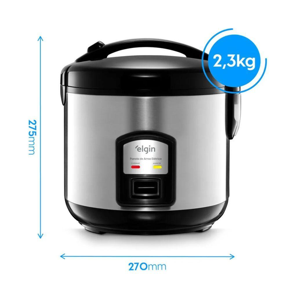 Panela De Arroz Elétrica 10 Xícaras 1,8L 700W Elgin 110VExperimente a praticidade e eficiência da Panela de Arroz Elétrica Gran Rizzo da Elgin e transforme suas refeições em momentos ainda mais especiais! Com capacidade para 10 xícaras, essa panela é perfeita para atender às necessidades das famílias. Com uma potência de 700W e voltagem de 110V, você terá seu arroz pronto em um piscar de olhos, sem complicações. Basta apertar um botão e pronto! E para garantir que seu arroz esteja sempre na temperatura perfeita, a função de manter aquecido é ideal.Além disso, a tampa basculante com sistema de trava não só oferece praticidade, mas também adiciona um toque elegante à sua cozinha. Além do arroz, a panela de arroz permite o preparo fácil e prático de diversos alimentos, como macarrão e legumes. E a limpeza é muito fácil, graças à cuba antiaderente. Além dos acessórios que acompanham a panela: colher, copo medidor e bandeja para preparo no vapor.Adquira agora a Panela de Arroz Elétrica Gran Rizzo da Elgin e desfrute de refeições deliciosas e sem complicações todos os dias!Características:Para até 10 xícaras1,8L de capacidadeRevestimento antiaderentePotência de 700WFunção manter aquecidoTampa basculante com travaAcompanha colher, copo medidor e bandejaBotão de travamento de tampaGarantia expressa de 1 anoEspecificações Técnicas:Nome do produto: Panela de Arroz Elétrica 10 Xícaras - 1,8L Função Manter Aquecido 700W 110VVoltagem: 127vPotência (W): 700Capacidade: 10 xícaras de arrozAcessórios: Copo dosador, colher para servir e bandeja para preparo no vaporFunções: Cozinhar e aquecerPossui dispositivo de segurança: NãoMantém o alimento quente enquanto ligada: NãoQR code com com diferentes receitas e tempo de cozimento: NãoEAN: 7908412551888