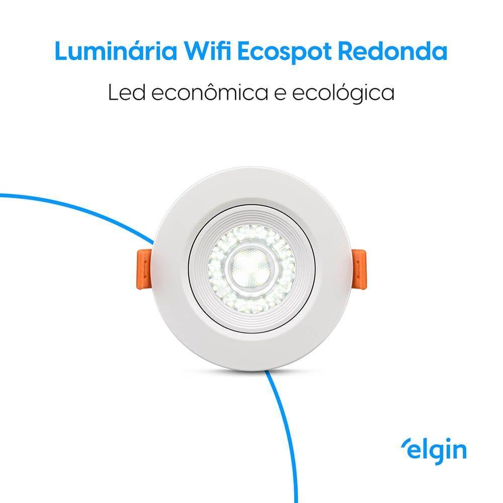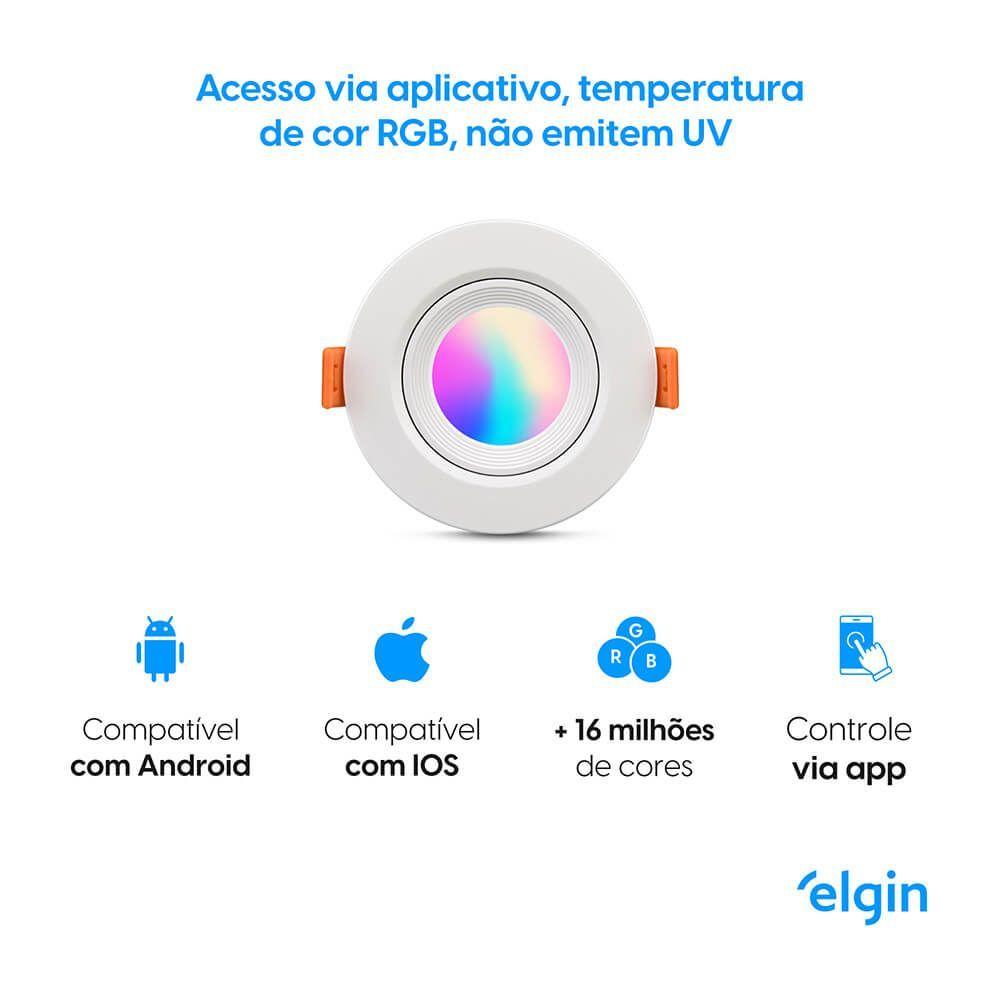 Luminária Smart Redonda Ecospot - 5w Rgb Compatível Com Alexa E Google Home BivoltA Luminária LED Ecospot Inteligente Wi-Fi Elgin é econômica e ecológica, podendo ser controlada de qualquer lugar através do seu celular, com o aplicativo Elgin Smart já instalado ou por comando de voz usando Amazon Alexa ou Google Assistant.A Luminária LED é Bivolt com potência de 5W, tem vida útil de longa duração e baixo consumo energético, economizando até 85% de energia. Com ela, você pode ajustar a intensidade da iluminação para cada momento: reduza a luz para assistir um filme na sala ou potencialize para a hora da leitura à noite.Temperatura de cor RGB -3000 -6500 kelvin para substituição das lâmpadas dicróicas convencionais, esse modelo tem durabilidade de 12 vezes mais que os modelos comuns e não esquenta o ambiente.Com timer programável, se precisar viajar, pode deixar a luz acesa para aumentar a segurança à noite. É só agendar horários específicos para acender ou apagar as luzes. E ainda por cima, é fácil de instalar: não é necessário mão de obra especializada, apenas instale no bocal modelo GU10 e conecte ao Wi-Fi.