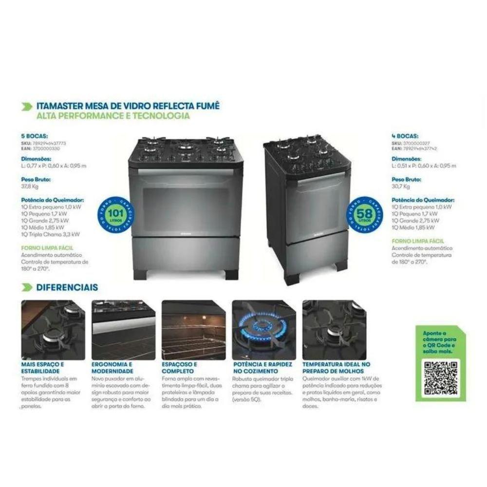 Fogão Itatiaia Itamaster 4 Bocas Preto/Reflecta BivoltFogão Itamaster 4 Bocas Preto/Reflecta - Itatiaia: Design Moderno e TecnológicoDescubra o Fogão 4 Bocas Preto/Reflecta da linha Itamaster, a escolha ideal para quem busca sofisticação aliada a funcionalidade. Este fogão combina um design moderno com tecnologia avançada, proporcionando , praticidade e eficiência no preparo das suas refeições diárias.Características do Fogão Itamaster 4 Bocas Preto/Reflecta:4 Queimadores: Facilitam o preparo das suas receitas, tornando a cozinha mais prática.Mesa de Vidro Temperado: Além de elegante, é resistente e fácil de limpar.Acendimento Automático: Basta girar o botão e o fogo se acende automaticamente.Trempes de Ferro Fundido: Proporcionam estabilidade e durante o uso.Botões e Manípulos Removíveis: Facilitam a limpeza e manutenção do fogão.Leve para Casa o Fogão Itamaster 4 Bocas Preto/ReflectaAproveite para adquirir agora o Fogão Itamaster 4 Bocas Preto/Reflecta e transforme sua experiência na cozinha. Não perca a chance de ter um fogão que une beleza e funcionalidade. NÃO FATURAMOS PARA CNPJ!Especificações do Fogão Itamaster 4 Bocas:Marca: ItatiaiaModelo: 000000003700000327Material predominante: Aço Voltagem: BivoltTipo: De pisoCor: PrataQuantidade de bocas: 4 Material Predominante: AçoMontagem: Não necessita de montagemAltura: 95cmLargura: 77cmProfundidade: 60cmPeso: 30,7kgCor: Preto/Reflecta