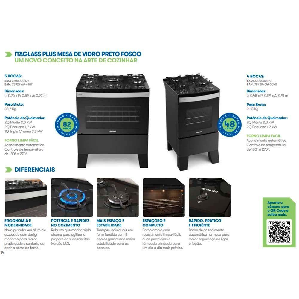 Fogão Itatiana Itaglass Plus 4 Bocas Preto BivoltO Fogão Itaglass Plus 4 Bocas é o eletrodoméstico que vai revolucionar a sua experiência na cozinha. Com um design moderno e funcional, este fogão é ágil no preparo de receitas, proporcionando praticidade e eficiência no seu dia a dia. Seu amplo forno e diversos recursos tornam a culinária mais prazerosa e descomplicada.Características PrincipaisNovo puxador em alumínio escovado para maior conforto ao abrir a porta do forno.Acendimento automático para facilidade no uso.Luz de forno blindada, garantindo segurança durante o preparo dos alimentos.Manípulos removíveis para uma limpeza mais prática.Por que escolher o Fogão Itaglass Plus 4 Bocas?O Fogão Itaglass Plus 4 Bocas é a escolha ideal para cozinhas compactas que necessitam de um eletrodoméstico que se adapte ao espaço disponível. Além disso, sua durabilidade e resistência garantem um investimento de qualidade para o seu lar.Adquira hoje mesmo o seu Fogão Itaglass Plus 4 Bocas e transforme a sua rotina na cozinha!Linha: Itaglass Plus Voltagem: BivoltCores: Preto Setor: Eletro Acompanha Manual de Instalação: Sim Bocas: 4 Bocas Tipo de Montagem: De chão Altura: 80.2cm Largura: 49.3cm Profundidade: 61cm Peso: 24.3kg Garantia: 12 meses