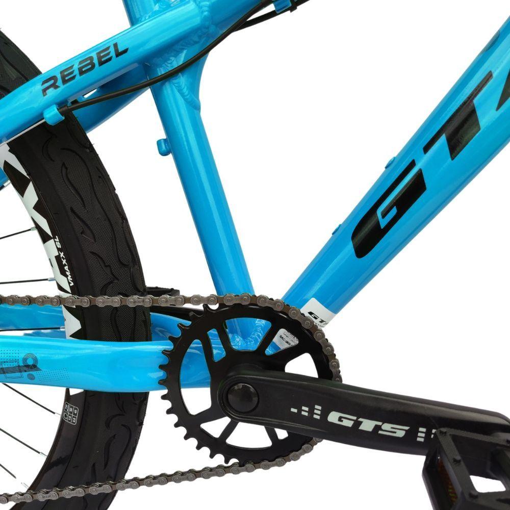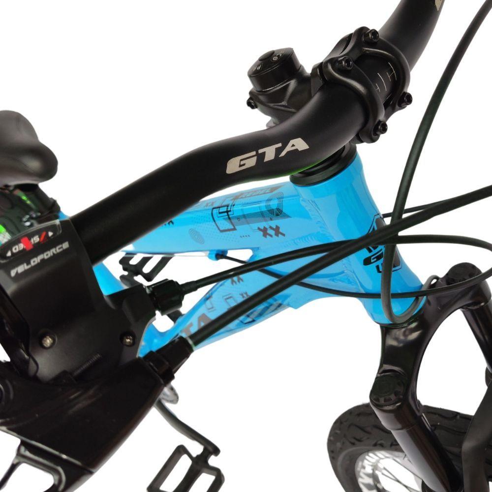 Bicicleta Aro 26 Gta Rebel Freeride Downhill Single 7v Rodas Vmaxx Freio A Disco Pneu Flame Preto AzulA Bicicleta 26 Aluminio Freeride Rebel GTA 7v Single Freio a Disco Suspensão Dianteira é a escolha ideal para os amantes de aventuras sobre duas rodas. Com um quadro em alumínio leve e resistente, esta bicicleta foi projetada para oferecer desempenho e durabilidade em desafios extremos. Seu design freeride permite que você mande as melhores e mais desafiadoras manobras com confiança e estilo.Equipada com freios a disco mecânico tanto na frente quanto atrás, a Rebel GTA garante paradas seguras e precisas, mesmo em descidas íngremes. Com 7 velocidades, você pode facilmente ajustar a marcha para se adequar ao seu ritmo e ao tipo de terreno, tornando cada rolê uma experiência agradável.A suspensão dianteira proporciona conforto e controle, absorvendo impactos e garantindo uma condução suave. Com um peso de apenas 15 kg, é fácil de manobrar e transportar, ideal para quem busca praticidade sem abrir mão da performance.Vamos conferir os componentes dessa máquina!- Quadro: GTA Rebel Aluminio 6061, Tamanho 14'- Suspensão: Dianteira Aço Preta Básica- Alavanca: Rapid Fire 7v Lado direito Sunrun- Aro: 26 Vzan VMAXX DH (o mais largo da categoria)- Camara: 26 Bico Grosso- Cambio Traseiro: Importado Index- Canote de Selim: Preto 27.2mm- Corrente: 7v Indexada 116L- Cubo: Preto Rosca Esfera Para Disco de 6P Com Blocagem- Freio: A Disco Mecânico discos 160mm- Guidão: 31.8mm Preto- Movimento Central: Blindado Preto 122mm- Movimento Direção: Semi Integrado Preto Ahead- Pedal: Nylon Plataforma 9/16- Pedivela: GTS Single Alum 34d Preto- Pneu: 26x2,125 paco Tipo Flame Preto- Raio: 251X2.0 Preto- Roda Livre: 7 Velocidades INDEX 14/28D- Selim: GTA Freeride- Suporte de Guidão: 31.8x60mm Preto AlumínioBicicleta pré montada, vai precisar apenas fixar a roda dianteira, guidão, selim e pedais. Recomendamos que seja feita uma revisão por um técnico após a recebimento do produto, para reajuste e regulagem, pois no transporte pode acontecer de alguma peça soltar ou desregularFotos meramente ilustrativas