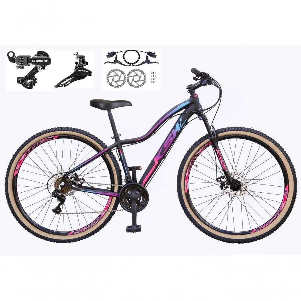 Bicicleta Feminina Aro 29 Ksw Mwza Alumínio 24v Cambios Shimano Freio A Disco Hidraulico preto/pink/Azul Tam: 17Procura uma bike boa e barata? Esta é uma ótima opção, bike 29 da Ksw Mwza, quadro com grafismo exclusivo e em alumínio, possui diversas cores e tamanhos, com 24 velocidades e possui sistema de rapid fire para troca de marchas,cambios Shimano, freios a disco Hidraulico, garfo com suspensão.Segue abaixo características da bike:Quadro Feminino 29 Ksw Mwza em alumínioGarfo 29 suspensão curso 60mmSuporte do guidão em alumínio pretoGuidão 31.8mm em alumínio pretoCanote do selim 27.2 s/carrinhoSelim Sport pretoAbraçadeira do Selim alumínio PretoAros Aero Parede dupla reforçadoRaios PretosCubos Pretos AçoPneus 29 Pretos com Lateral BegeMovimento central selado rolamentadoFreios a disco Hidraulico com discos inox 160mmAlavancas Semi-automáticas Rapid FireCâmbio Traseiro Shimano TZCâmbio Dianteiro Shimano TZCorrente IndexPedivela Aço RevestidoPedal Plataforma Nylon pretoRoda Livre 8v index douradaBicicleta pré montada, vai precisar apenas fixar a roda dianteira, guidão, selim e pedais. Recomendamos que seja feita uma revisão por um técnico após a recebimento do produto, para reajuste e regulagem, pois no transporte pode acontecer de alguma peça soltar ou desregularFotos meramente ilustrativas