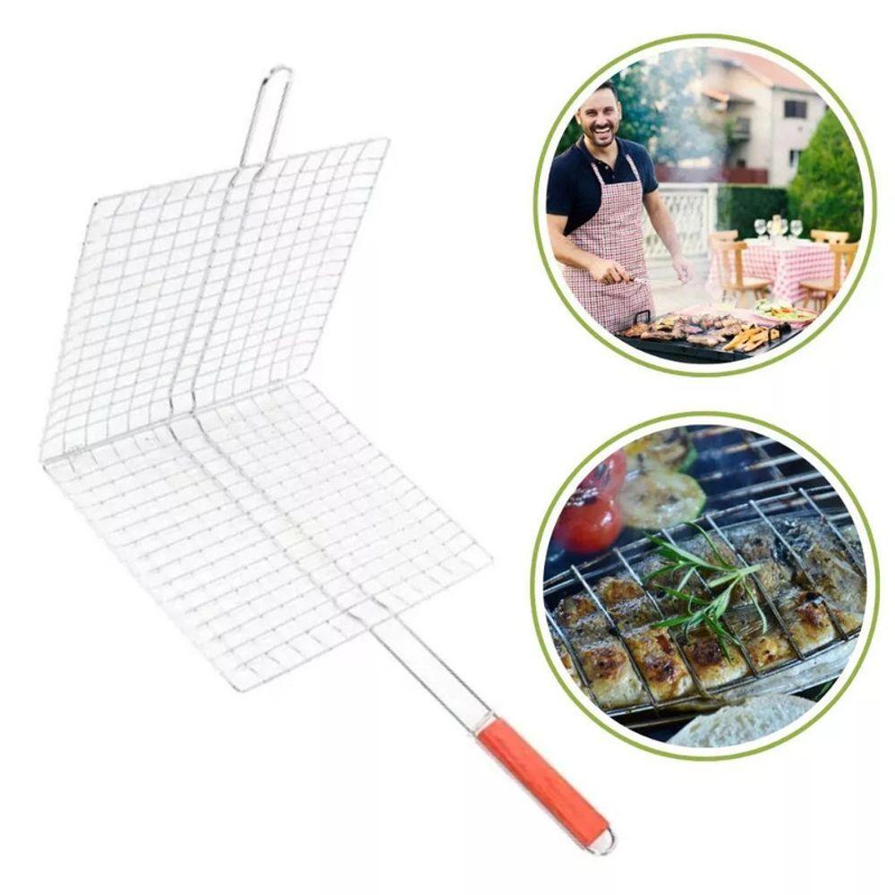 Grelha Dupla Abre E Fecha Churrasco Carne Frango Linguiça LeGrelha Dupla para Churrasco com Cabo de Madeira – Mais Sabor e Eficiência no Seu ChurrascoLeve seus momentos de churrasco a outro nível com a Grelha Dupla para Churrasco com Cabo de Madeira. Desenvolvida para garantir mais praticidade, segurança e sabor na hora de assar carnes, peixes, frangos e legumes, ela é ideal para quem valoriza agilidade no preparo e resultados perfeitos na brasa.Destaques do Produto:Alta resistência e durabilidade: Fabricada em aço inoxidável de excelente qualidade, a grelha suporta altas temperaturas sem deformar, mesmo com uso frequente.Fecho de segurança: Sistema de travamento firme que mantém os alimentos no lugar, evitando quedas durante o manuseio.Assado uniforme e rápido: Permite virar todos os alimentos de uma só vez, garantindo cozimento por igual e mais rapidez no preparo.Cabo de madeira alongado e anatômico: Proporciona firmeza, conforto e proteção contra o calor excessivo, facilitando o uso com total segurança.Fácil de limpar: Superfície lisa e cromada que facilita a remoção de resíduos com água e sabão neutro, economizando tempo após o churrasco.Versátil para diferentes ambientes: Compatível com churrasqueiras a carvão ou gás, perfeita para uso em casa, no sítio ou na praia.Especificações Técnicas:Material: Aço inoxidável e madeiraMedidas da grelha: 22 cm x 20 cm (aprox.)Medidas do cabo: 20 cm x 3,5 cm (aprox.)Garanta agora a sua Grelha Dupla para Churrasco e aproveite o melhor da brasa com mais praticidade, sabor e segurança. Ideal para quem não abre mão de um bom churrasco em qualquer ocasião!