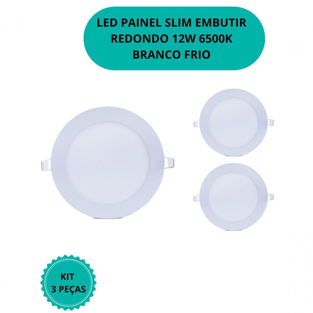 Plafon Led Slim 12w Redondo Embutir 6500k Branco Frio Bivolt - Kit Com 3 Un.