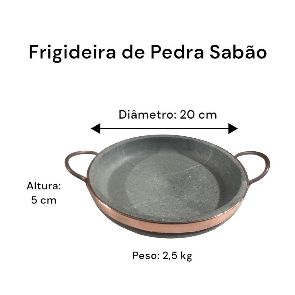 Frigideira + Panela De Pedra Sabão Com Tampas De Vidro Com Pegador ExclusivoKIT PANELA + FRIGIDEIRA DE PEDRA SABÃO TAMPAS DE VIDRO COM PEGADOR EXCLUSIVOPanela de Pedra Sabão 1500 ml- Diâmetro: 18 cm- Altura: 10 cm- Peso: 3 kgFrigideira:- Diâmetro: 20 cm- Altura: 4 cm- Peso: 1,500 kgMatéria prima- Pedra Sabão e Cobre** Por se tratar de um produto natural e artesanal pode haver pequenas variações de coloração, traços, medidas ou capacidade em relação a descrição e fotos.** Os produtos de Pedra Sabão devem passar por um processo de cura, que sela e aumenta a resistência da pedra. O processo é simples e leva apenas alguns minutos. Enviaremos instruções de como curar seu produto. Com a cura a pedra escurece, ficando num tom próximo ao preto.O uso de pedra sabão tem sido cada vez mais comum em cozinhas de todo o . Inclusive, é uma febre entre chefes de cozinha e influencers da área de gastronomia. Além de dar mais sabor aos alimentos, proporciona muitos benefícios para a nossa saúde. Estudos recentes mostraram que, durante o processo de cozimento em utensílios de pedra sabão, há transmissão de nutrientes benéficos como o ferro, , cálcio e magnésio da panela para os alimentos.A ingestão de ferro contribui para aumento da nossa energia e disposição, além de prevenir o envelhecimento precoce, melhorar nossa concentração, reduzir o risco de doenças e fortalecer cabelo e unhas.Já o auxilia no fortalecimento do nosso sistema imunológico e ajuda a acelerar o processo de cicatrização e afastar o surgimento de infecções e outras doenças, como o e alguns tipos de câncer.O cálcio, por sua vez, é fundamental para a mineralização dos nossos ossos e dentes. Também é o principal agente responsável pela divisão , pela contração dos músculos, secreção de hormônios e coagulação sanguínea.O magnésio é um mineral que desempenha um papel em mais de 300 reações enzimáticas em nosso organismo. Dentre as suas funções estão o auxílio na função muscular e nervosa, além de contribuir para regular nossa pressão sanguínea e fortalecer nosso sistema imunológico.