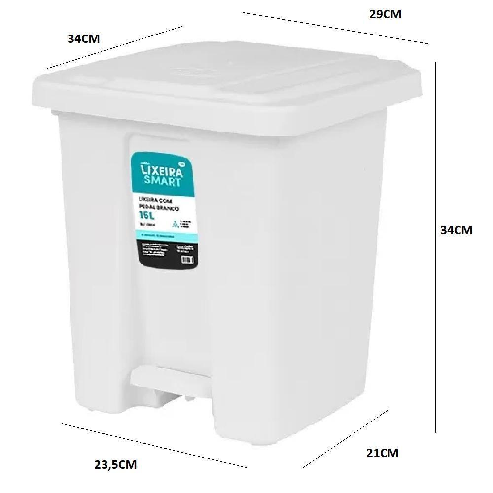 Lixeira Pedal 15 Litros Grande Cesto De Lixo Casa Banheiro Cozinha Comercio Coleta Seletiva Reforcada PlasticoLixeira com Pedal Branco 15L – Praticidade, Higiene e Design ModernoMantenha sua casa sempre limpa e organizada com a Lixeira Plus 15 Litros com Pedal.Com design moderno e acabamento elegante, ela é perfeita para cozinhas, banheiros, escritórios e lavanderias, garantindo funcionalidade e estilo em qualquer ambiente.Seu sistema de abertura por pedal permite descartar o lixo sem o uso das mãos, mantendo a higiene e evitando o contato direto com resíduos.Fabricada em plástico resistente de alta durabilidade, essa lixeira oferece leveza, praticidade e longa vida útil, além de um fechamento suave que impede a propagação de odores.Compacta por fora e espaçosa por dentro, é a escolha ideal para quem busca um produto funcional, bonito e fácil de limpar.Benefícios do ProdutoAbertura por pedal: mais higiene e praticidade no dia a dia.Design moderno e elegante: combina com qualquer ambiente.Material durável: fabricada em plástico de alta resistência.Fechamento suave: evita ruídos e odores desagradáveis.Capacidade ideal (15L): perfeita para uso doméstico ou profissional.Fácil de limpar: superfície lisa e resistente à umidade.Multiuso: ideal para banheiros, cozinhas, lavanderias e escritórios. Especificações TécnicasModelo: Lixeira Plus com PedalCapacidade: 15 litrosMaterial: Plástico resistente (polipropileno de alta qualidade)Cor: BrancoDimensões: 34 cm (Altura) × 29 cm (Largura) × 30,5 cm (Profundidade) Conteúdo da Embalagem1 Lixeira Plus com Pedal 15L Mais higiene, estilo e praticidade para o seu dia a dia!Lixeira com Pedal Branco 15L – Praticidade, Higiene e Design Moderno Mantenha sua casa sempre limpa e organizada com a Lixeira Plus 15 Litros com Pedal. Com design moderno e acabamento elegante, ela é perfeita para cozinhas, banheiros, escritórios e lavanderias, garantindo funcionalidade e estilo em qualquer ambiente. Seu sistema de abertura por pedal permite descartar o lixo sem o uso das mãos, mantendo a higiene e evitando o contato direto com resíduos. Fabricada em plástico resistente de alta durabilidade, essa lixeira oferece leveza, praticidade e longa vida útil, além de um fechamento suave que impede a propagação de odores. Compacta por fora e espaçosa por dentro, é a escolha ideal para quem busca um produto funcional, bonito e fácil de limpar. Benefícios do Produto Abertura por pedal: mais higiene e praticidade no dia a dia.Design moderno e elegante: combina com qualquer ambiente. Material durável: fabricada em plástico de alta resistência. Fechamento suave: evita ruídos e odores desagradáveis. Capacidade ideal (15L): perfeita para uso doméstico ou profissional. Fácil de limpar: superfície lisa e resistente à umidade. Multiuso: ideal para banheiros, cozinhas, lavanderias e escritórios. Especificações Técnicas Modelo: Lixeira Plus com Pedal Capacidade: 15 litros Material: Plástico resistente (polipropileno de alta qualidade) Cor: Branco Dimensões: 34 cm (Altura) × 29 cm (Largura) × 30,5 cm (Profundidade) Conteúdo da Embalagem 1 Lixeira Plus com Pedal 15L Mais higiene, estilo e praticidade para o seu dia a dia!