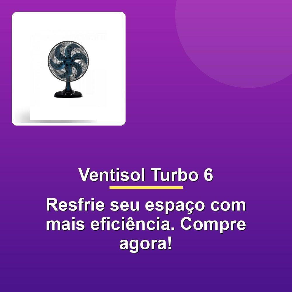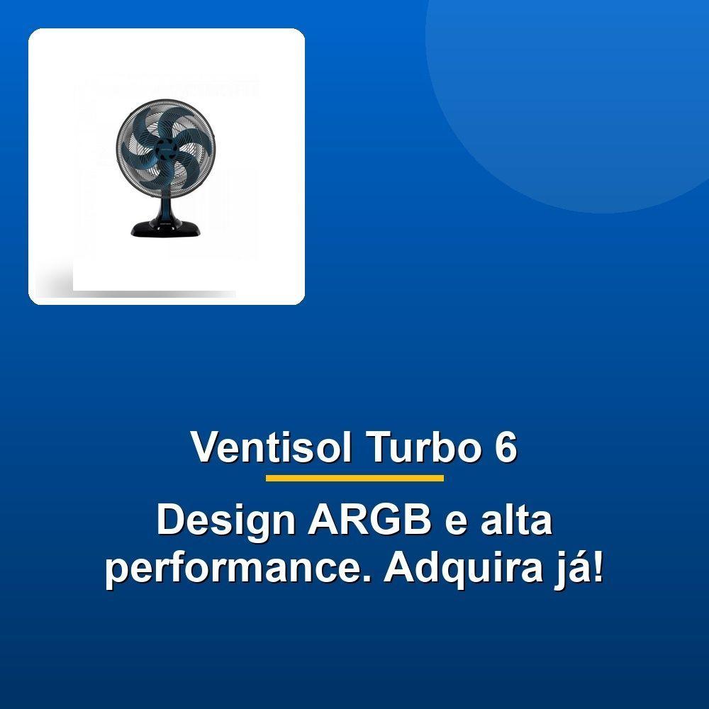 Ventisol Ventilador Mesa Turbo 6 50cm Azul 127vDiga adeus ao calor intenso e olá para um ambiente refrescante e agradável com o Ventilador de Mesa Ventisol Turbo 6. Projetado para um conforto excepcional, ele conta com um potente motor turbo que garante uma ventilação intensa sem incomodar o seu sossego. A hélice de 6 pás, com design aerodinâmico inovador, distribui o ar com precisão e eficiência, criando uma brisa suave e refrescante por toda a sua casa.Com dimensões ideais, seu design moderno e arrojado se adapta a qualquer ambiente. A nova base e o acabamento da grade, além de conferirem um visual sofisticado, proporcionam maior estabilidade para o ventilador.Controle a intensidade do fluxo de ar com três velocidades diferentes, ajustando-o de acordo com suas necessidades. A funcionalidade de oscilação horizontal garante uma dispersão uniforme do ar, enquanto a regulagem de inclinação manual permite direcionar a brisa para exatamente onde você precisa.O Ventisol Turbo 6 também se destaca por sua inteligência energética, possuindo a melhor classificação de energia do mercado (Classe A no INMETRO), economizando energia e contribuindo para um futuro mais sustentável.Com suporte de parede integrado, o ventilador pode ser usado no chão, em mesas ou fixado à parede, oferecendo versatilidade e praticidade para você aproveitar o ar fresco ovunque esteja ao seu alcance.Diga adeus ao calor intenso e olá para um ambiente refrescante e agradável com o Ventilador de Mesa Ventisol Turbo 6. Projetado para um conforto excepcional, ele conta com um potente motor turbo que garante uma ventilação intensa sem incomodar o seu sossego. A hélice de 6 pás, com design aerodinâmico inovador, distribui o ar com precisão e eficiência, criando uma brisa suave e refrescante por toda a sua casa.Com dimensões ideais, seu design moderno e arrojado se adapta a qualquer ambiente. A nova base e o acabamento da grade, além de conferirem um visual sofisticado, proporcionam maior estabilidade para o ventilador.Controle a intensidade do fluxo de ar com três velocidades diferentes, ajustando-o de acordo com suas necessidades. A funcionalidade de oscilação horizontal garante uma dispersão uniforme do ar, enquanto a regulagem de inclinação manual permite direcionar a brisa para exatamente onde você precisa.O Ventisol Turbo 6 também se destaca por sua inteligência energética, possuindo a melhor classificação de energia do mercado (Classe A no INMETRO), economizando energia e contribuindo para um futuro mais sustentável.Com suporte de parede integrado, o ventilador pode ser usado no chão, em mesas ou fixado à parede, oferecendo versatilidade e praticidade para você aproveitar o ar fresco ovunque esteja ao seu alcance.