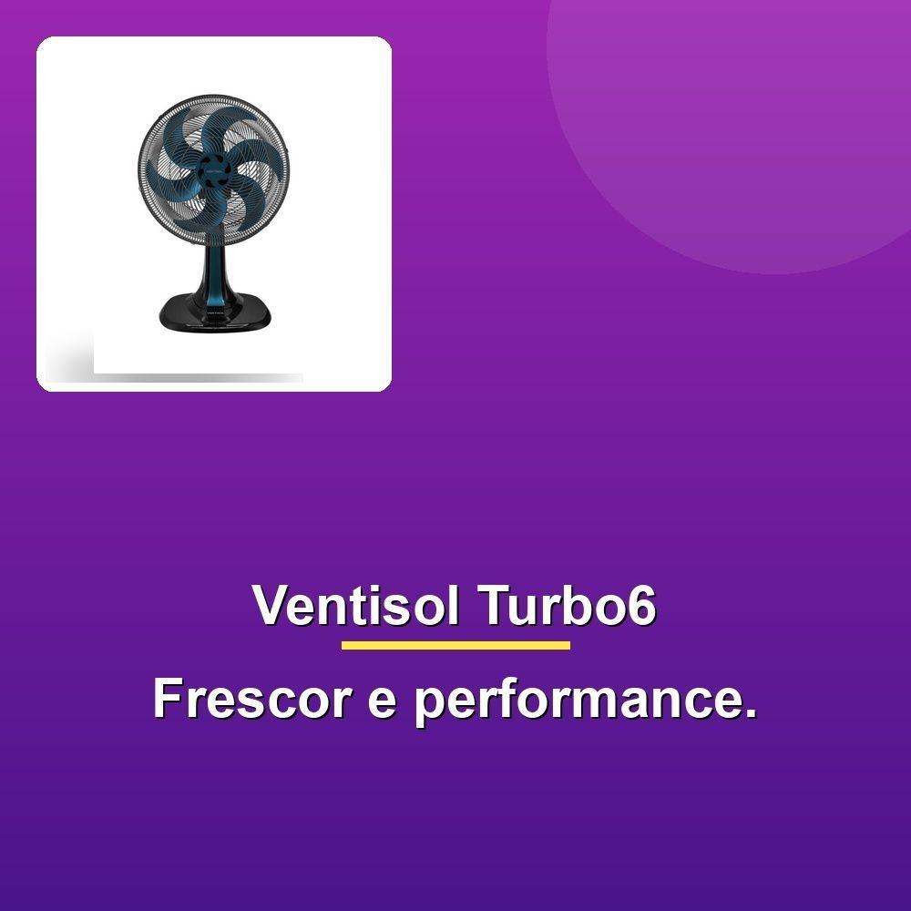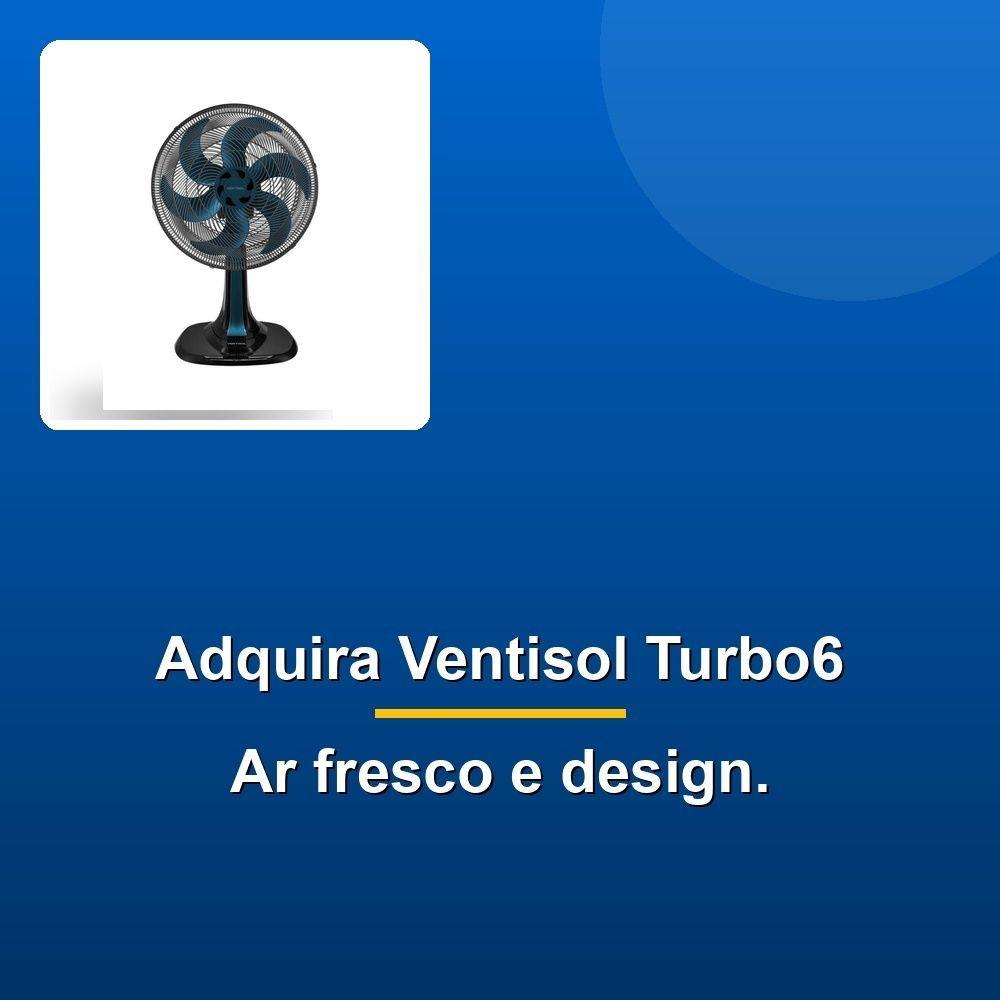 Ventisol Ventilador Mesa Turbo6 30cm Azul 220vO Ventilador de Mesa Ventisol Turbo 6 é a solução perfeita para manter seu ambiente fresco e agradável, ideal para toda a família. Com seu potente motor turbo e a aerodinâmica de sua hélice de seis pás, ele garante uma ventilação irresistível, silenciosa e eficiente. Diga adeus aos dias quentes e úmidos com a brisa refrescante do Ventisol Turbo 6.Seu design moderno e arrojado, com base e acabamento da grade inovadores, conferem maior estabilidade e um toque contemporâneo à decoração do seu espaço. Ajuste a intensidade do vento de acordo com suas preferências com três velocidades, controladas diretamente na capa protetora do motor. A tecnologia Wind-line da grade direciona o ar com precisão, garantindo uma melhor distribuição e sensação de frescor em todo o ambiente.Para seu conforto, o Ventisol Turbo 6 conta com regulagem manual de inclinação, permitindo direcionar o vento para exatamente onde você precisa. A oscilação automática garante uma circulação de ar homogênea por todo o ambiente, ideal para áreas de até 20m². Além disso, o Ventisol Turbo 6 é classificado como Classe A no INMETRO, o que significa menor consumo de energia e economia para você.Com suporte de parede integrado, o Ventisol Turbo 6 se adapta a diferentes espaços e necessidades, podendo ser usado no chão, na mesa ou na parede. Experimente o Ventilador de Mesa Ventisol Turbo 6 e sinta a diferença!O Ventilador de Mesa Ventisol Turbo 6 é a solução perfeita para manter seu ambiente fresco e agradável, ideal para toda a família. Com seu potente motor turbo e a aerodinâmica de sua hélice de seis pás, ele garante uma ventilação irresistível, silenciosa e eficiente. Diga adeus aos dias quentes e úmidos com a brisa refrescante do Ventisol Turbo 6.Seu design moderno e arrojado, com base e acabamento da grade inovadores, conferem maior estabilidade e um toque contemporâneo à decoração do seu espaço. Ajuste a intensidade do vento de acordo com suas preferências com três velocidades, controladas diretamente na capa protetora do motor. A tecnologia Wind-line da grade direciona o ar com precisão, garantindo uma melhor distribuição e sensação de frescor em todo o ambiente.Para seu conforto, o Ventisol Turbo 6 conta com regulagem manual de inclinação, permitindo direcionar o vento para exatamente onde você precisa. A oscilação automática garante uma circulação de ar homogênea por todo o ambiente, ideal para áreas de até 20m². Além disso, o Ventisol Turbo 6 é classificado como Classe A no INMETRO, o que significa menor consumo de energia e economia para você.Com suporte de parede integrado, o Ventisol Turbo 6 se adapta a diferentes espaços e necessidades, podendo ser usado no chão, na mesa ou na parede. Experimente o Ventilador de Mesa Ventisol Turbo 6 e sinta a diferença!