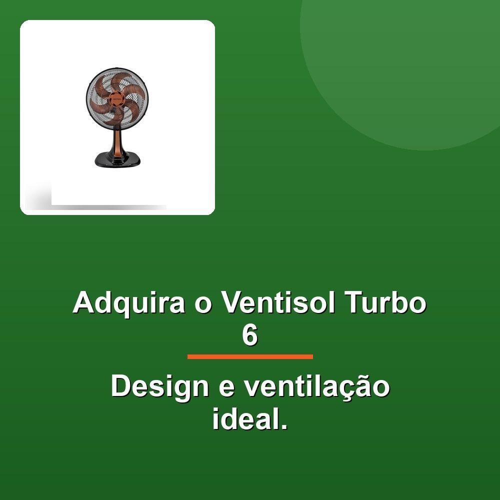 Ventisol Ventilador Mesa Turbo 6 30cm Bronze 220vEscape do calor com a potência e o design moderno do Ventilador de Mesa Ventisol Turbo 6. Perfeito para toda a família, ele garante uma ventilação potente e silenciosa, graças ao seu motor turbo de alta performance e hélice de 6 pás. A nova base e o acabamento da grade, com design arrojado, oferecem maior estabilidade ao aparelho. Crie o clima ideal para você com três velocidades ajustáveis na capa protetora do motor, permtittingo controlar a intensidade do vento de acordo com a sua preferência.A tecnologia Wind-line da grade garante uma melhor vazão e direcionamento do ar, enquanto a oscilação automática distribui o vento por todo o ambiente. Ajuste o ângulo de inclinação manual para direcionar o fluxo de ar exatamente onde precisar. Ele é certificado como Classe A no INMETRO, garantindo maior eficiência energética e economia para você. Com seu suporte de parede integrado, o Ventisol Turbo 6 pode ser usado no chão, na mesa ou na parede, adaptando-se a qualquer ambiente.Desfrute de um ambiente refrescante e agradável com o Ventilador de Mesa Ventisol Turbo 6.Escape do calor com a potência e o design moderno do Ventilador de Mesa Ventisol Turbo 6. Perfeito para toda a família, ele garante uma ventilação potente e silenciosa, graças ao seu motor turbo de alta performance e hélice de 6 pás. A nova base e o acabamento da grade, com design arrojado, oferecem maior estabilidade ao aparelho. Crie o clima ideal para você com três velocidades ajustáveis na capa protetora do motor, permtittingo controlar a intensidade do vento de acordo com a sua preferência.A tecnologia Wind-line da grade garante uma melhor vazão e direcionamento do ar, enquanto a oscilação automática distribui o vento por todo o ambiente. Ajuste o ângulo de inclinação manual para direcionar o fluxo de ar exatamente onde precisar. Ele é certificado como Classe A no INMETRO, garantindo maior eficiência energética e economia para você. Com seu suporte de parede integrado, o Ventisol Turbo 6 pode ser usado no chão, na mesa ou na parede, adaptando-se a qualquer ambiente.Desfrute de um ambiente refrescante e agradável com o Ventilador de Mesa Ventisol Turbo 6.