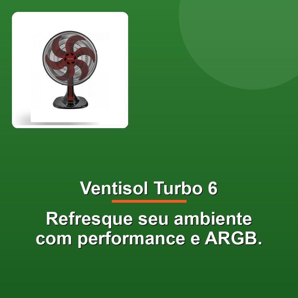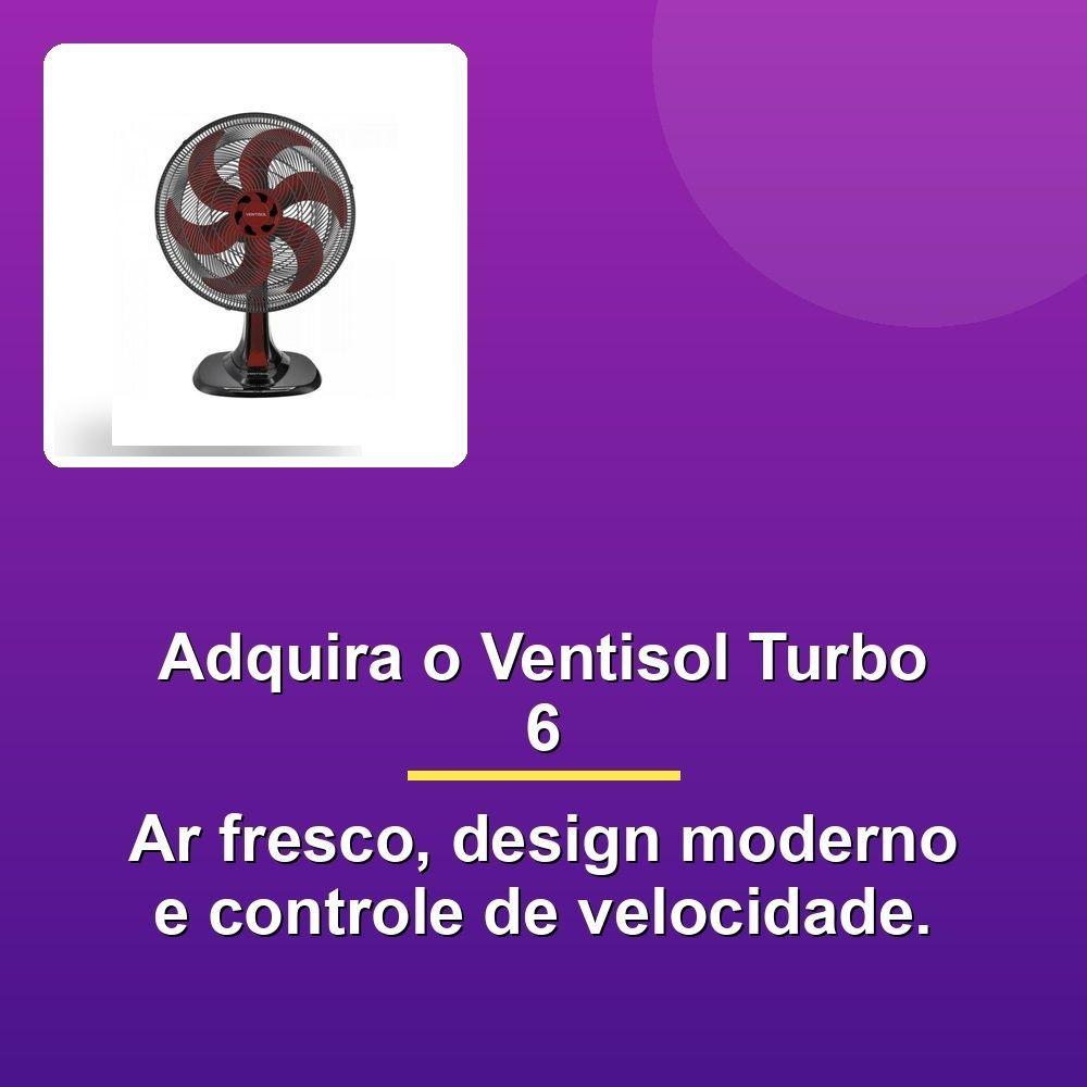 Ventisol Ventilador Mesa Turbo 6 40cm Vermelho 127vAquelecte calor? Sofre com el calor? Apresentamos o Ventilador de Mesa Ventisol Turbo 6, seu aliado para um ambiente fresco e agradável. Com sua potente tecnologia turbo, este ventilador de 40cm de diâmetro entrega ar fresco com máxima eficiência, graças à sua hélice de 6 pás desenvolvida com aerodinâmica inovadora. Prepare-se para se refrescar com o Ventisol Turbo 6, que oferece performance incomparável e um nível sonoro surpreendentemente baixo.Redesenhado para maior estável e modernidade, o Ventisol Turbo 6 possui uma base e acabamento de grade arrojados. O controle na capa protetora do motor permite ajustes de três velocidades, otimizando seu nível de frescor. O sistema Wind-line na grade garante um fluxo de ar direcionado e potente, enquanto a funcionalidade de oscilação automática protege uma área maior.E para você ter o controle total do seu conforto, o Ventisol Turbo 6 conta com regulagem de inclinação manual. Ademais, com certificação Classe A no INMETRO, você garante uma excelente classificação energética, economizando no seu consumo. Ele é versátil e pode ser utilizado no chão, em mesas ou fixado na parede, graças ao seu suporte integrado. Com o Ventisol Turbo 6 você desfruta de um ar mais fresco e confortável em qualquer cantinho da sua casa.Aquelecte calor? Sofre com el calor? Apresentamos o Ventilador de Mesa Ventisol Turbo 6, seu aliado para um ambiente fresco e agradável. Com sua potente tecnologia turbo, este ventilador de 40cm de diâmetro entrega ar fresco com máxima eficiência, graças à sua hélice de 6 pás desenvolvida com aerodinâmica inovadora. Prepare-se para se refrescar com o Ventisol Turbo 6, que oferece performance incomparável e um nível sonoro surpreendentemente baixo.Redesenhado para maior estável e modernidade, o Ventisol Turbo 6 possui uma base e acabamento de grade arrojados. O controle na capa protetora do motor permite ajustes de três velocidades, otimizando seu nível de frescor. O sistema Wind-line na grade garante um fluxo de ar direcionado e potente, enquanto a funcionalidade de oscilação automática protege uma área maior.E para você ter o controle total do seu conforto, o Ventisol Turbo 6 conta com regulagem de inclinação manual. Ademais, com certificação Classe A no INMETRO, você garante uma excelente classificação energética, economizando no seu consumo. Ele é versátil e pode ser utilizado no chão, em mesas ou fixado na parede, graças ao seu suporte integrado. Com o Ventisol Turbo 6 você desfruta de um ar mais fresco e confortável em qualquer cantinho da sua casa.